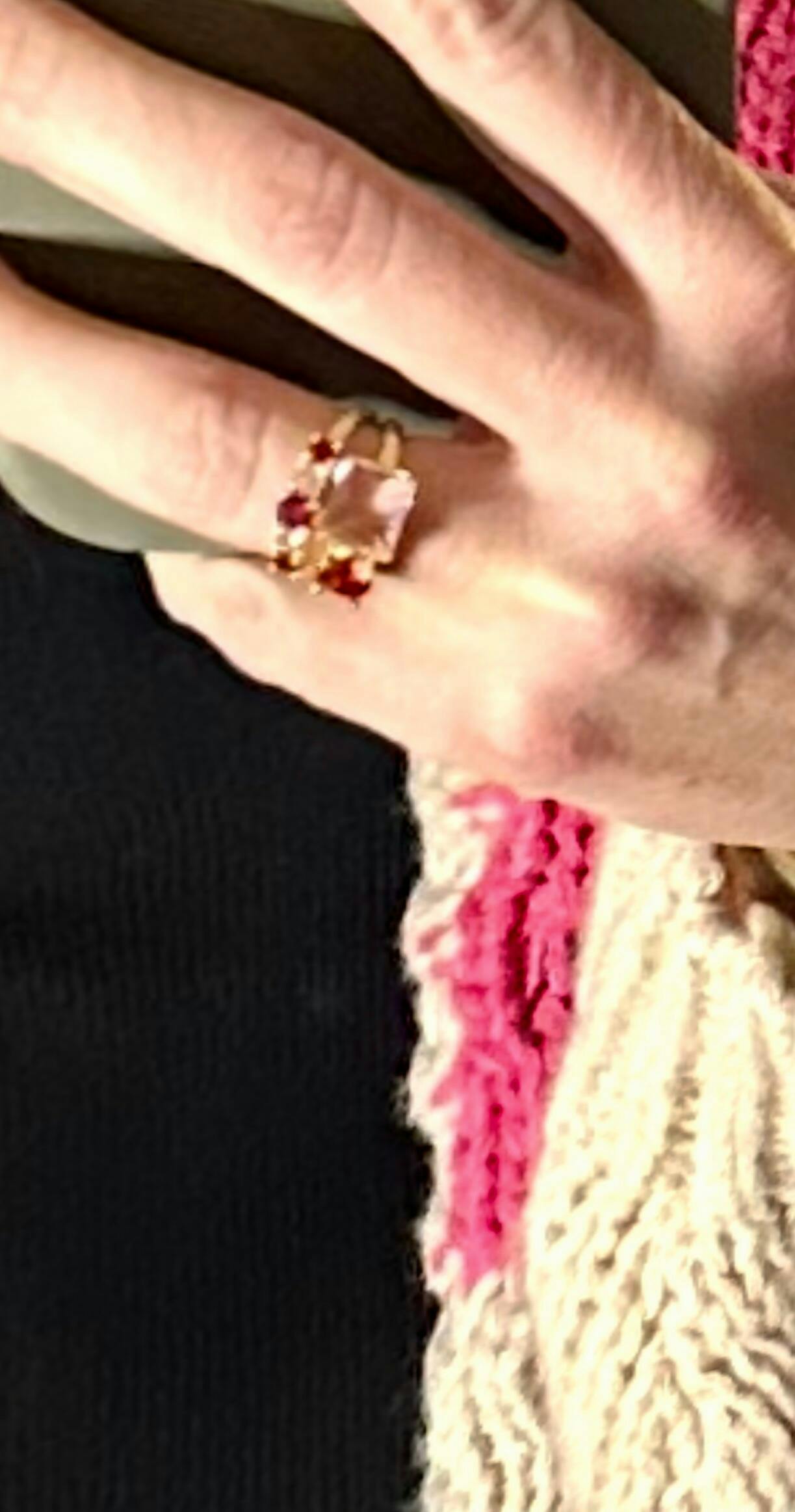 A true statement of sparkle and romance, the Rosé Radiance Ring is designed to steal the spotlight. Featuring a stunning blush pink emerald cut stone at the center, this ring is accented with rich ruby toned gems and delicate pale pink crystals for a layered, luxe look. The gold band adds warmth and elegance, making this piece feel both timeless and modern.