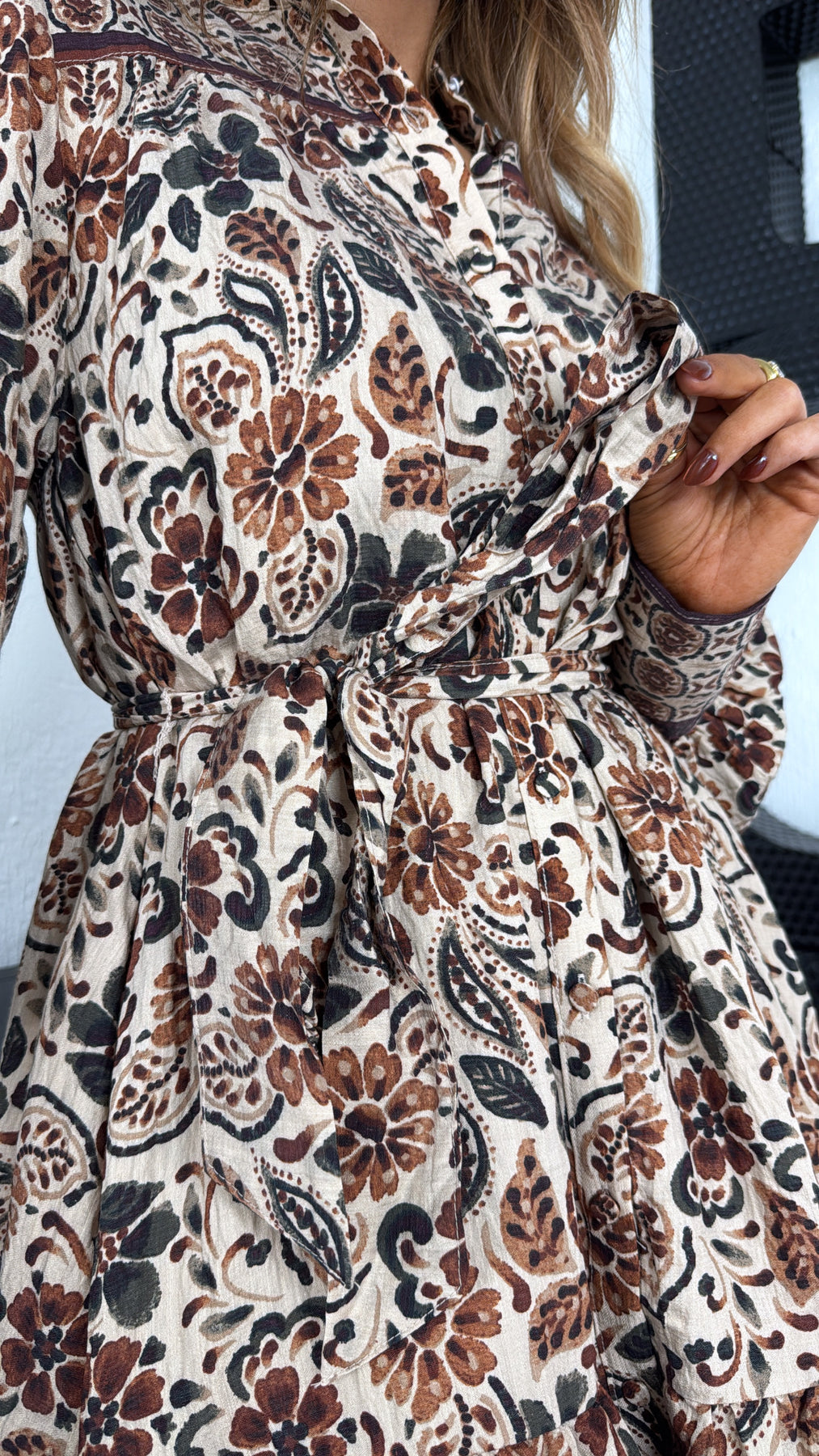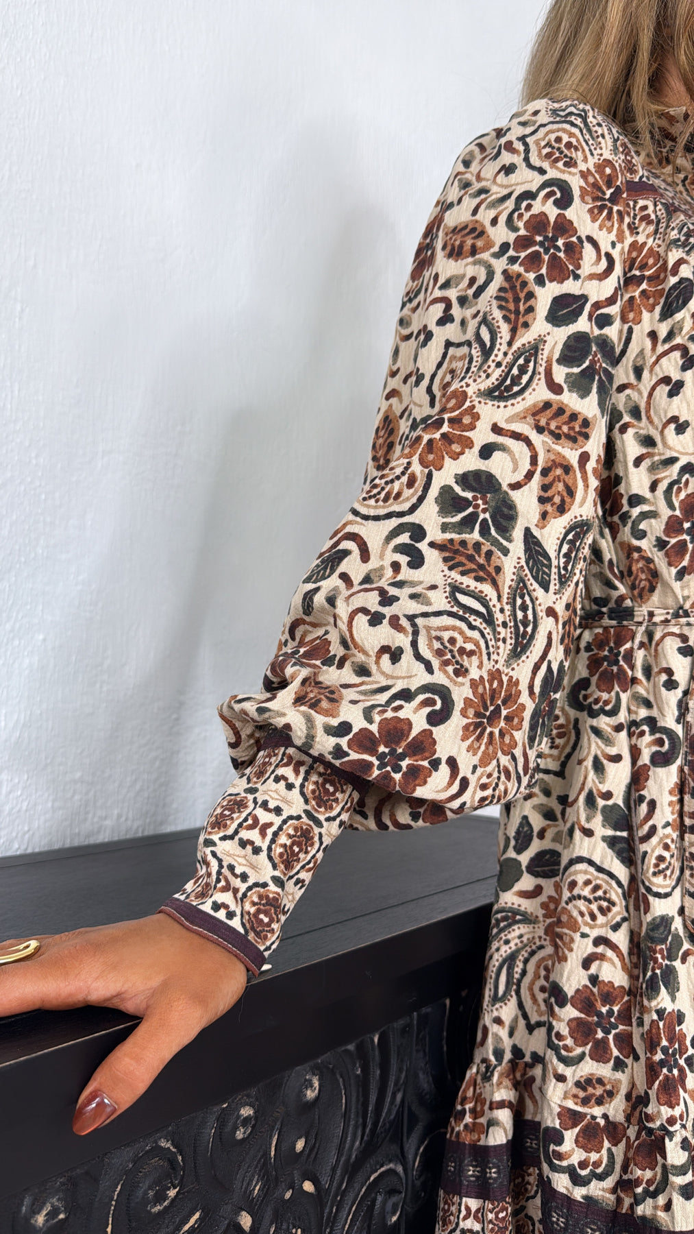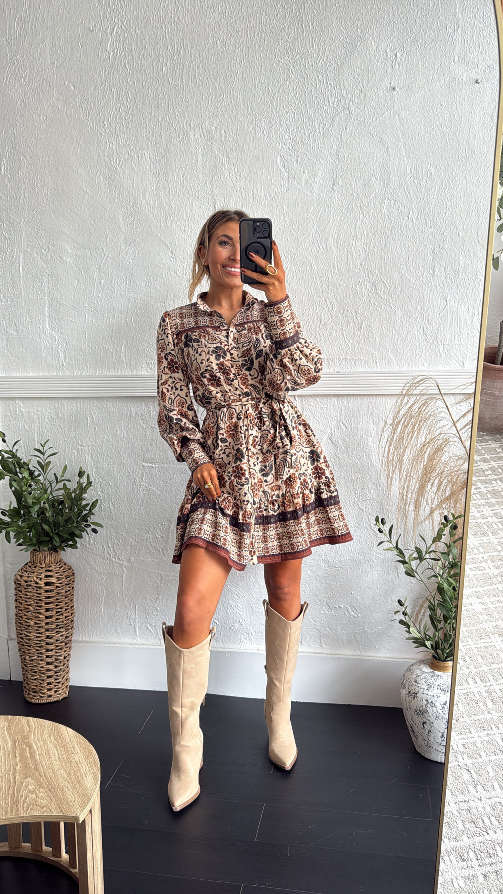 Romantic, earthy, and full of charm the Bluewood Bloom Mini Dress is your go-to for effortless boho elegance. Designed with a vintage-inspired floral print in warm, autumnal tones, this dress features a flowy tiered skirt and statement sleeves that make every twirl feel special. The collared neckline and button down front add a touch of structure, while the self-tie waist flatters your shape with ease.