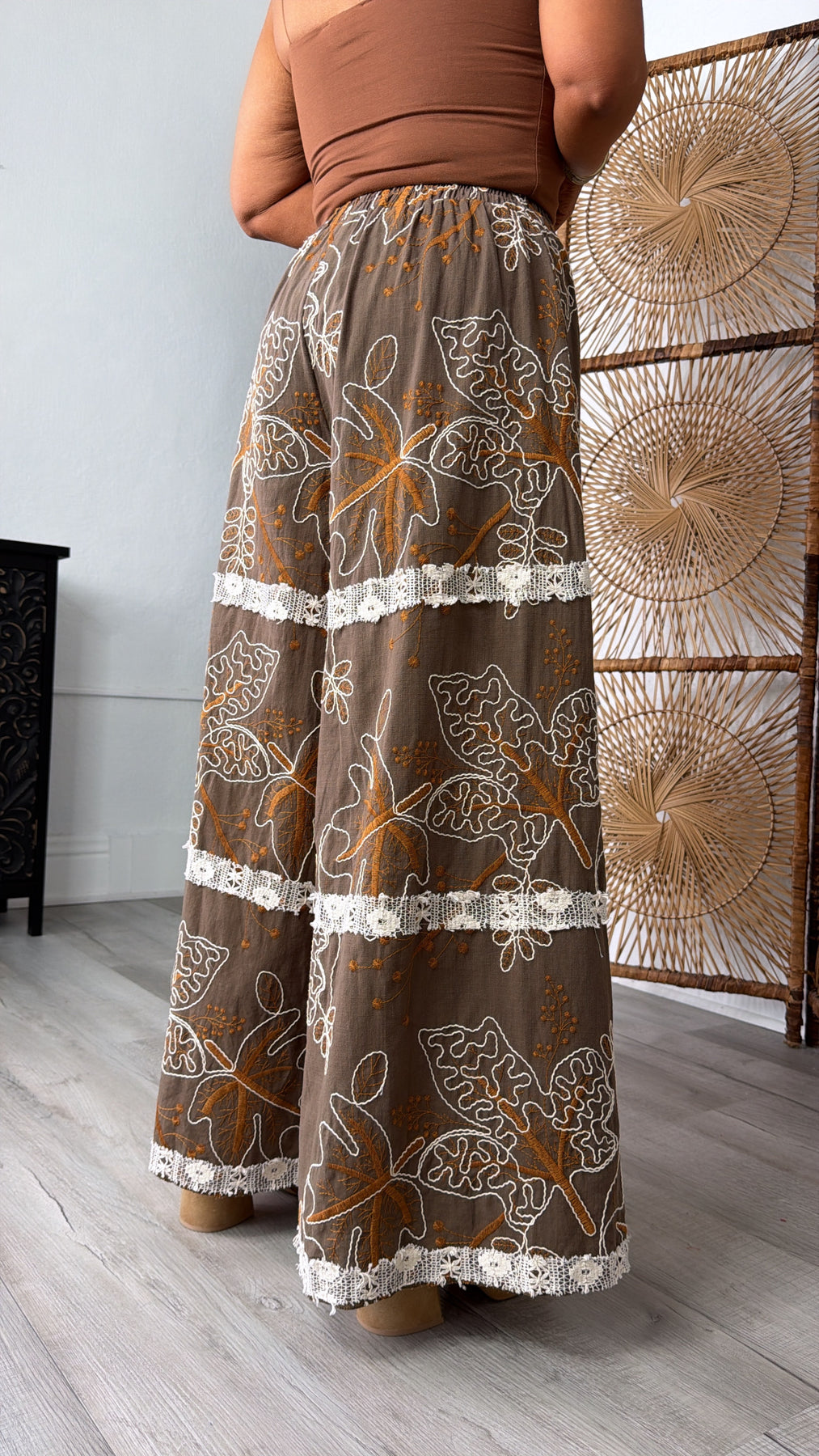 The Fallen Oak Leaf Pant blends comfort and boho charm with their relaxed fit and beautifully rich color wave of chocolate and apricot . Featuring an elastic waistband, soft flowy fabric, and lace patchwork detailing cream, these joggers are perfect for effortless, laid-back days.
