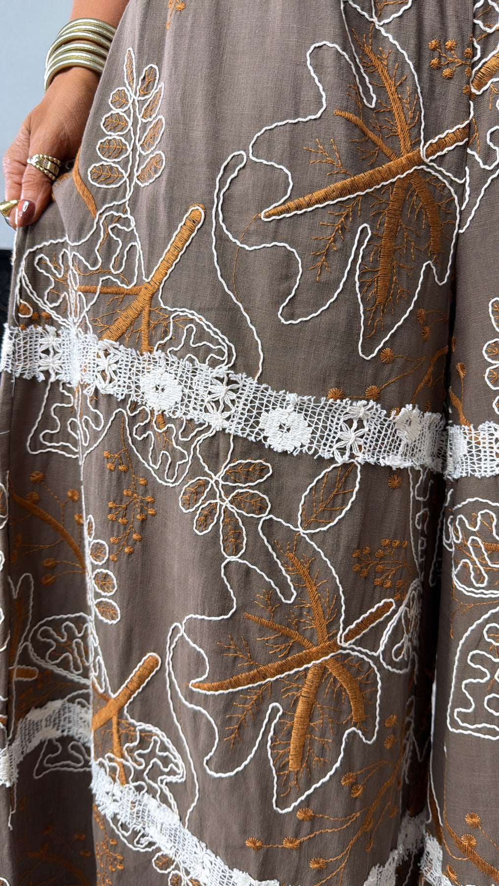 • Boho embroidered leaf pattern throughout