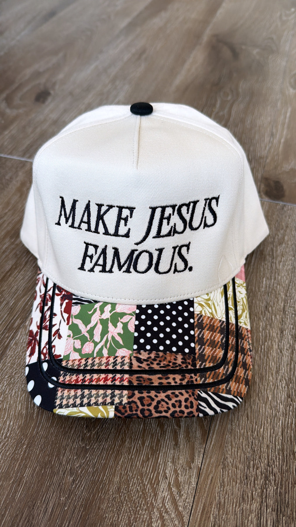 Bold faith meets bold style in this standout patchwork trucker hat. Featuring a clean cream crown embroidered with Make Jesus Famous., this hat keeps the message front and center while delivering eye-catching personality with its colorful, mixed-print bill. From florals and polka dots to animal print and retro patterns, every patch adds a touch of joy and uniqueness.