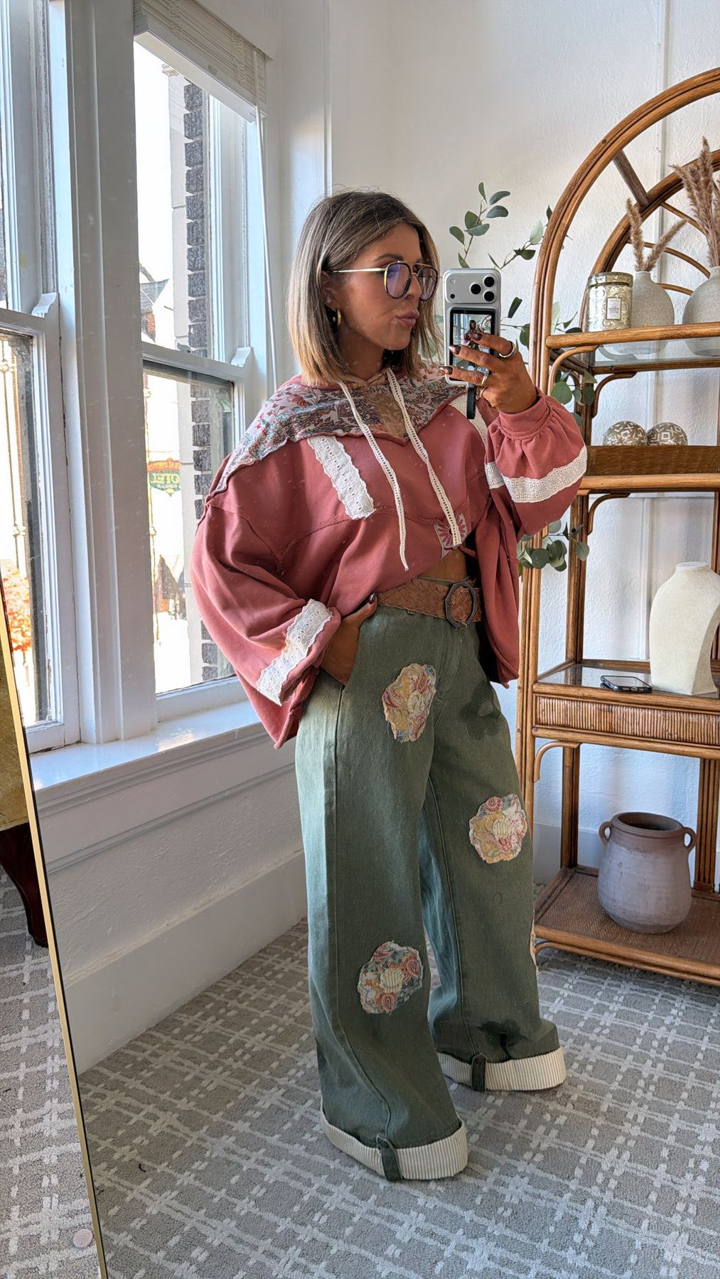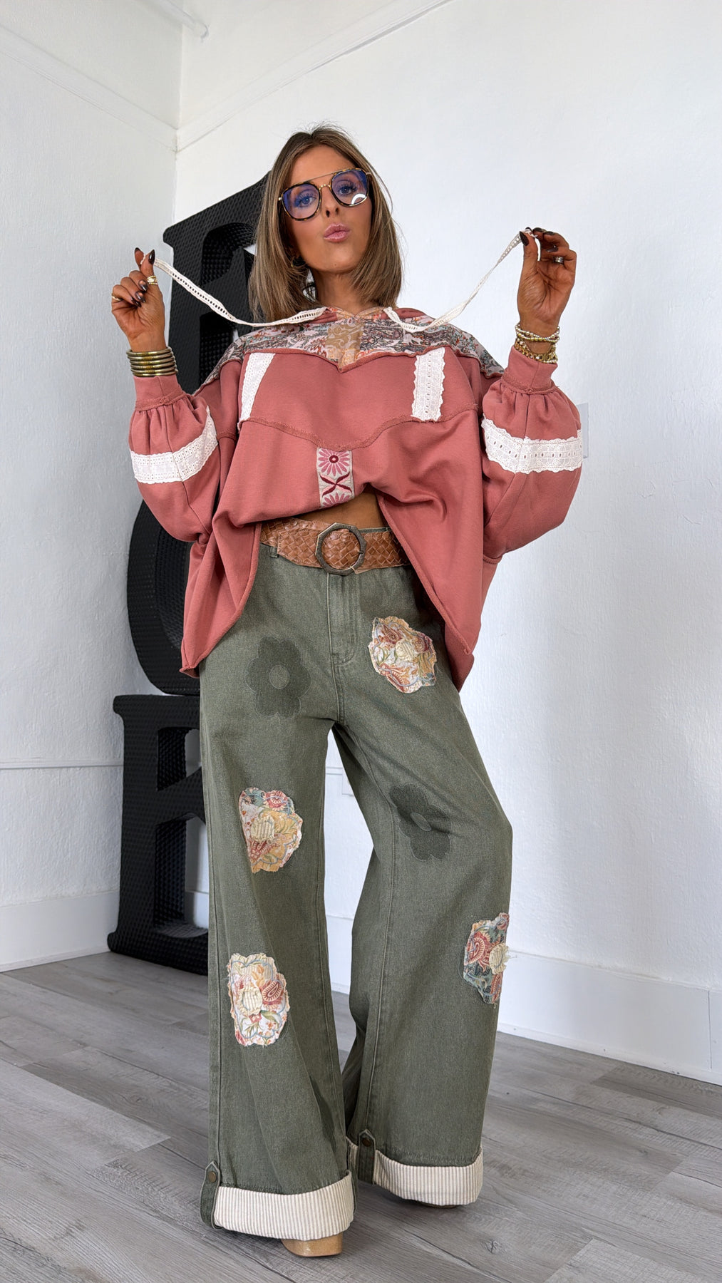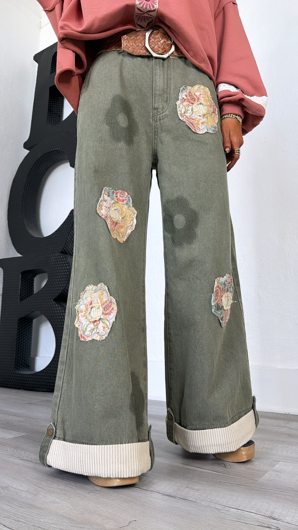 Embrace the patchwork vibes in our Mosswood Floral Pant. These pants feature an Olive colored body with floral patchwork detail and a unique folded bottom option with corduroy fabrication and a bronze button closure. Designed with an elastic back waistband providing ultimate comfort!