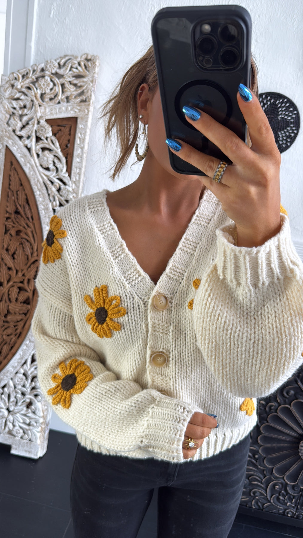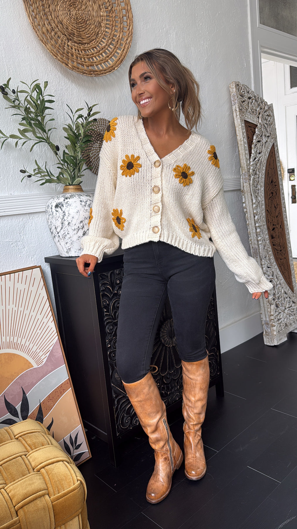 Wrap yourself in charm with our Sunflower Fields Cardigan. This playful piece features a knit fabric and 3D Sunflower design, perfect for layering over any outfit. Stay cute and trendy with this cardigan.