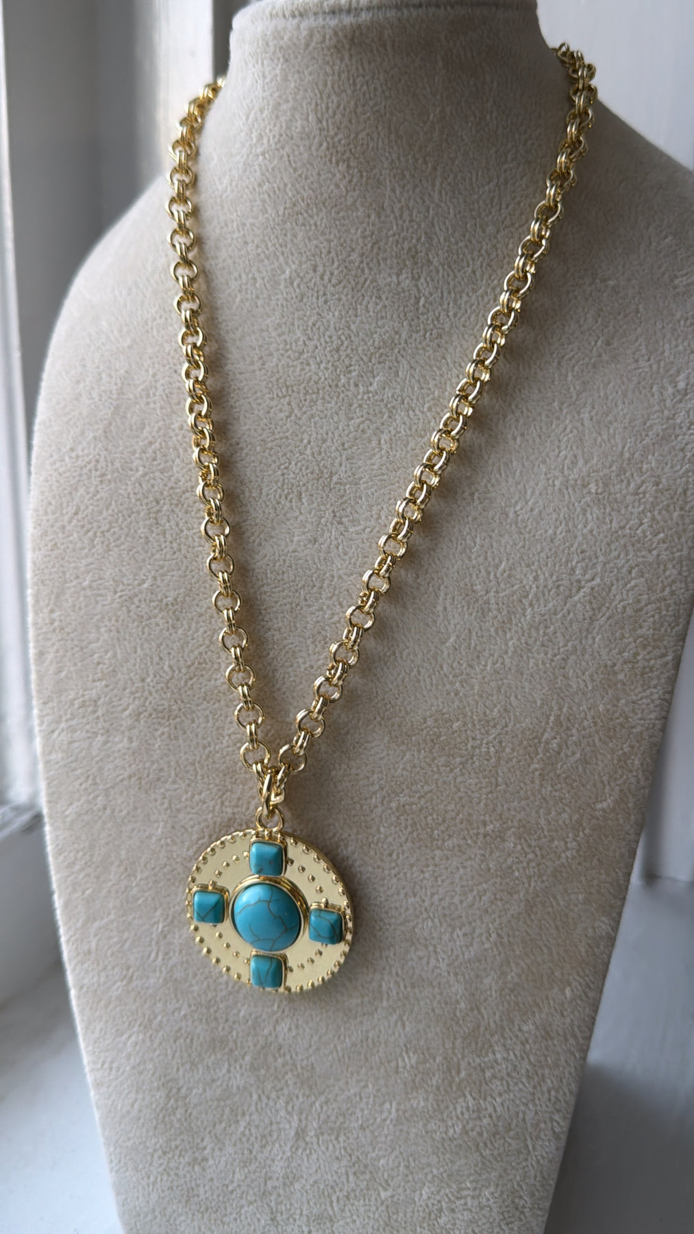 Infused with a hint of desert charm, the Azure Pendant Necklace is a statement piece that effortlessly blends bold design with timeless elegance. The chunky gold chain adds a touch of modern sophistication, while the round pendant showcases turquoise-style stones arranged in a striking cross pattern for an artisanal, Southwestern-inspired look.