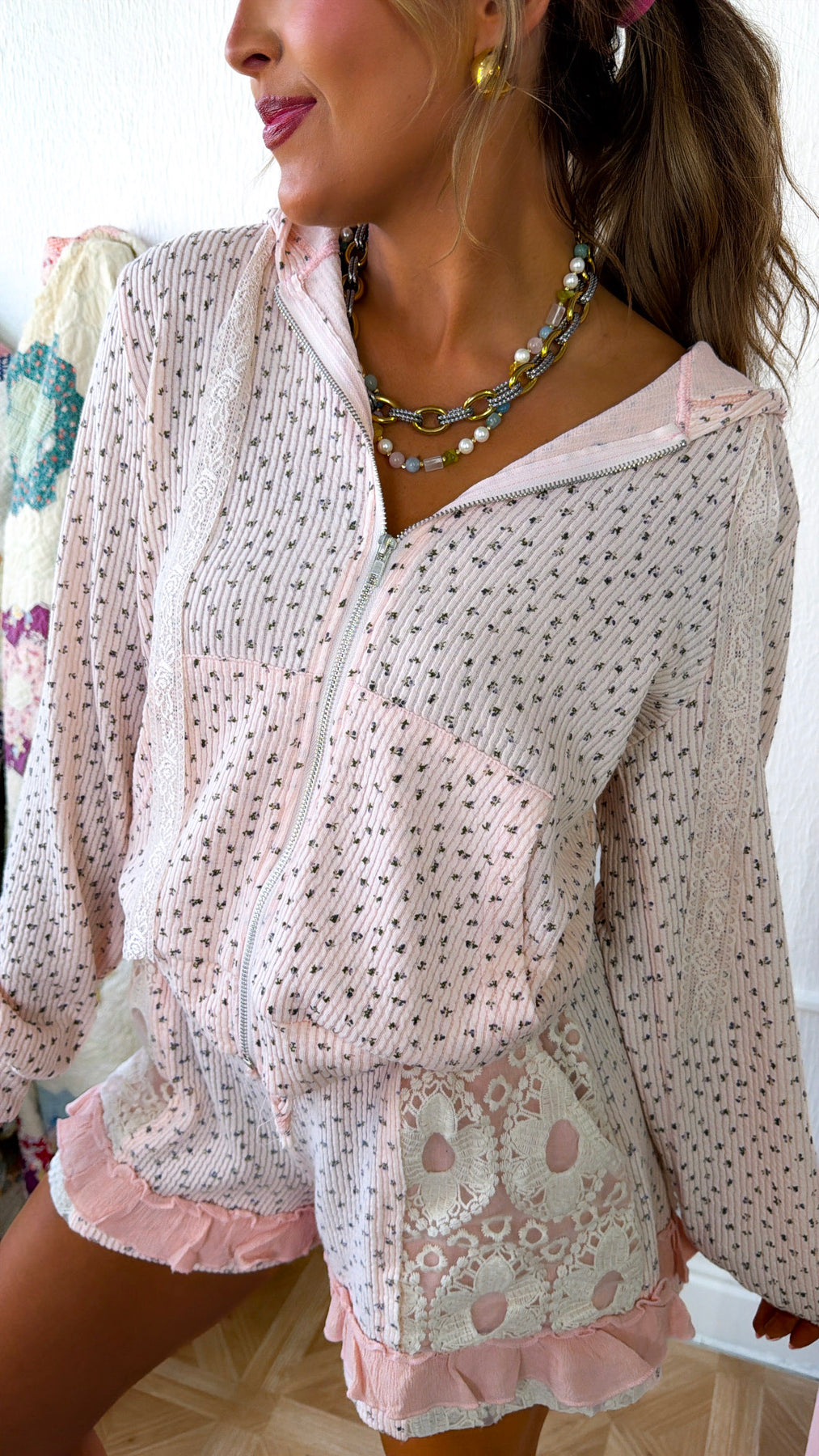 Soft, feminine, and effortlessly cozy. The Bayrose Floral Zip Up Jacket is the sweetest layering piece your wardrobe has been waiting for. With its delicate blush tone, dainty floral print, and romantic lace patchwork details, this zip-up brings charm to even your most casual days.