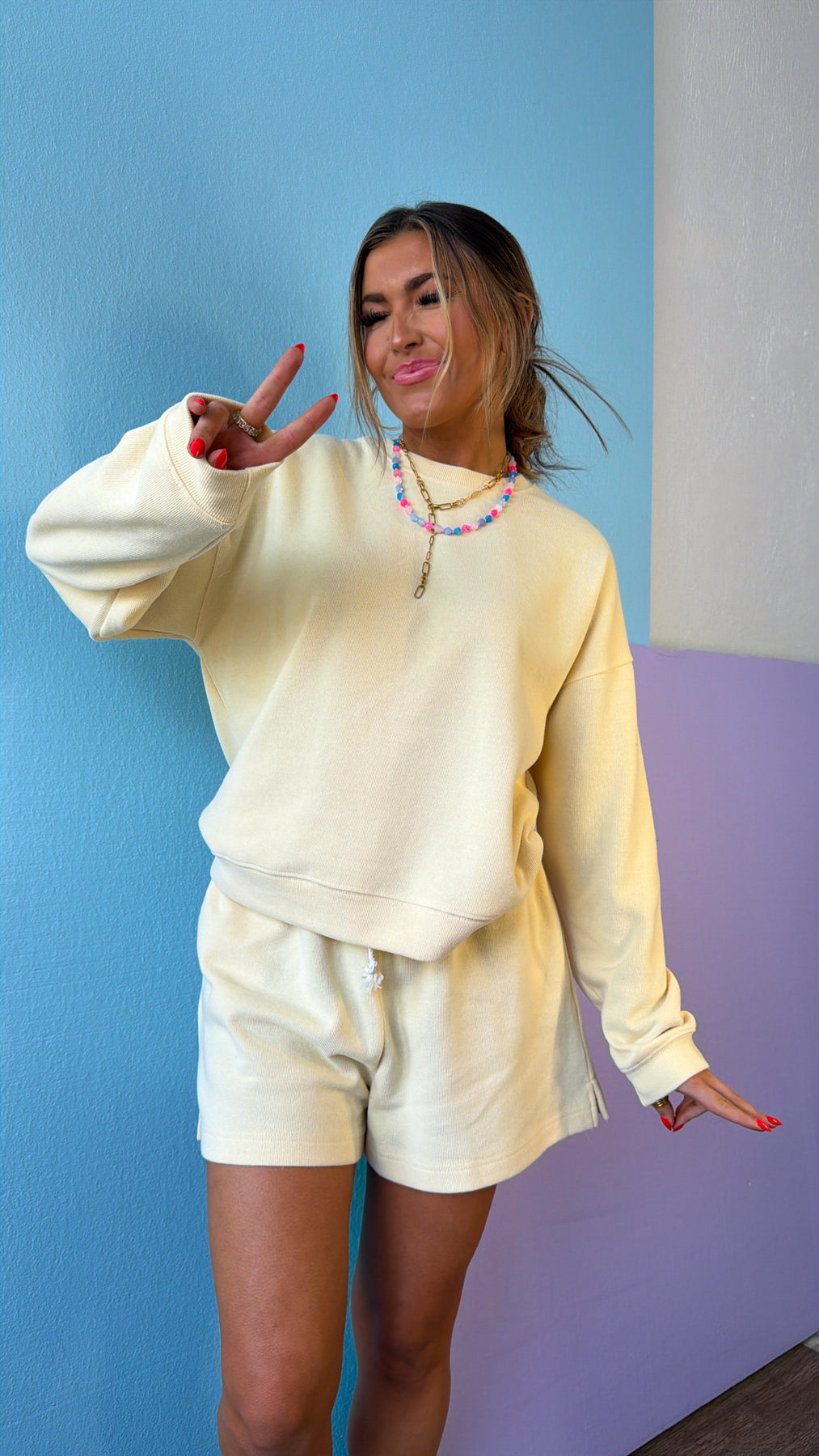 Soft, sunny, and made for feel good days. The Sunshine Basic Lounge Set in Lemon brings effortless comfort with a cheerful pop of color. Featuring a relaxed long-sleeve sweatshirt and matching drawstring shorts, this set is perfect for lounging at home, casual errands, or soaking up slow mornings in style.