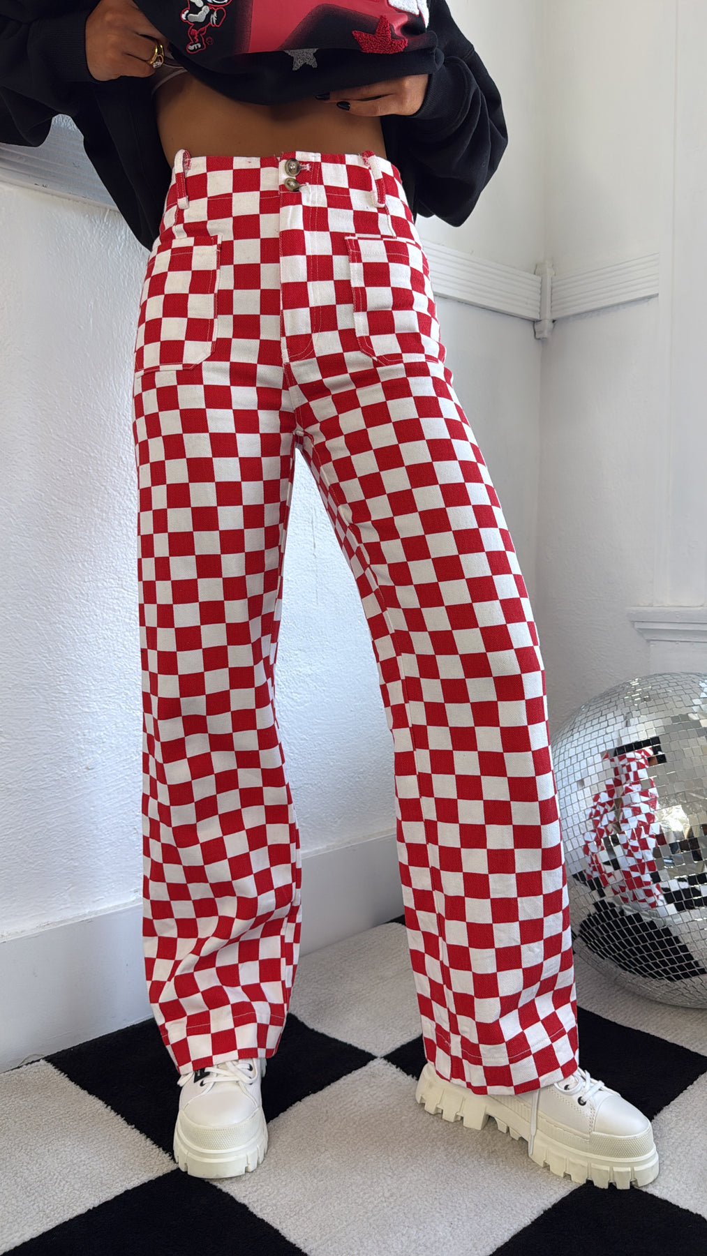 Our Finish Line Checkered Pants are sure to turn heads. These checkered pants are featured in a, high waisted design with a functional zipper and buttons. These pants have a cool girl energy look that we absolutely love.