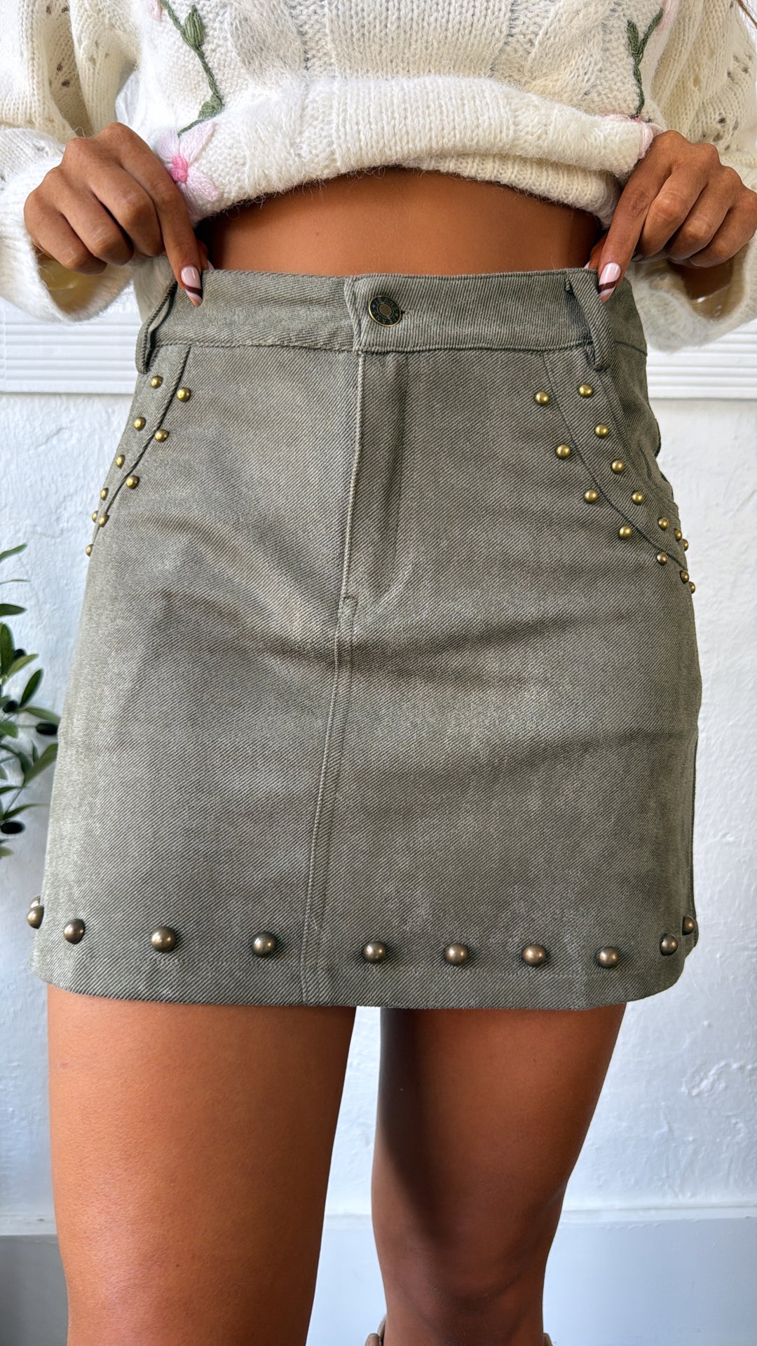 Fancy That Faux Leather Ruched Midi Skirt, Green