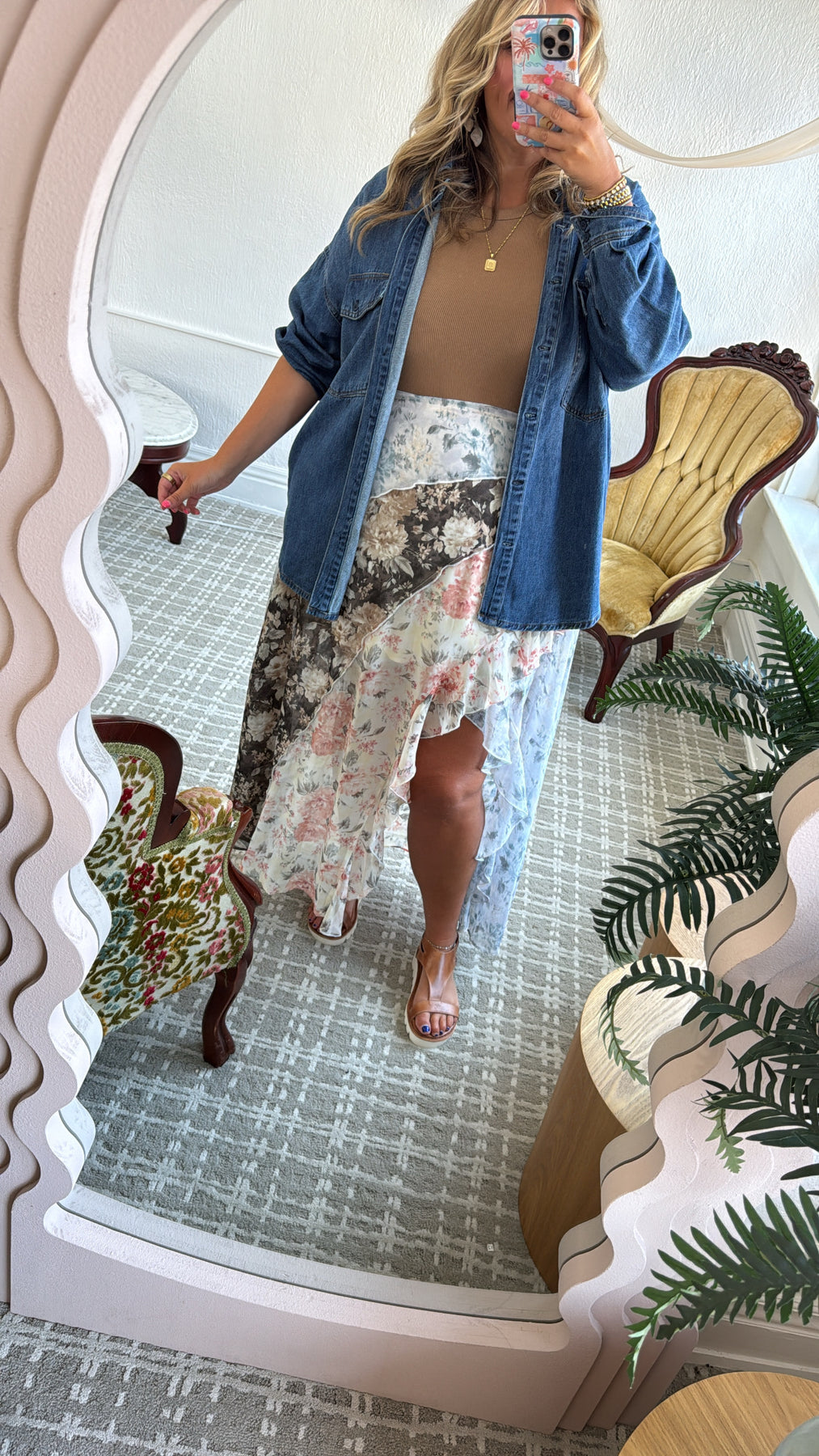 Soft, flowy, and full of boho charm, the All Mine Mix Print Chiffon Ruffle Maxi Skirt is the perfect piece to float through the seasons. With its romantic floral patterns and layered ruffles, this skirt brings effortless movement and feminine detail to every step.
