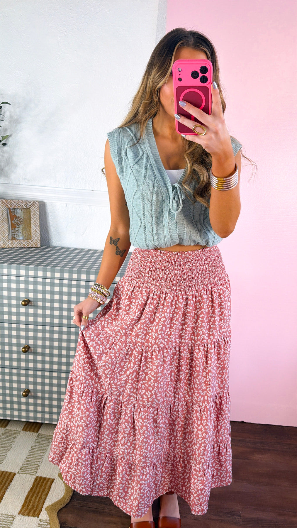 Designed in a warm ginger hue with delicate white floral print, this tiered midi features a flattering high-rise elastic waistband for all-day comfort. The flowy silhouette and soft gathers create beautiful movement with every step, making it perfect for dressing up or keeping casual.