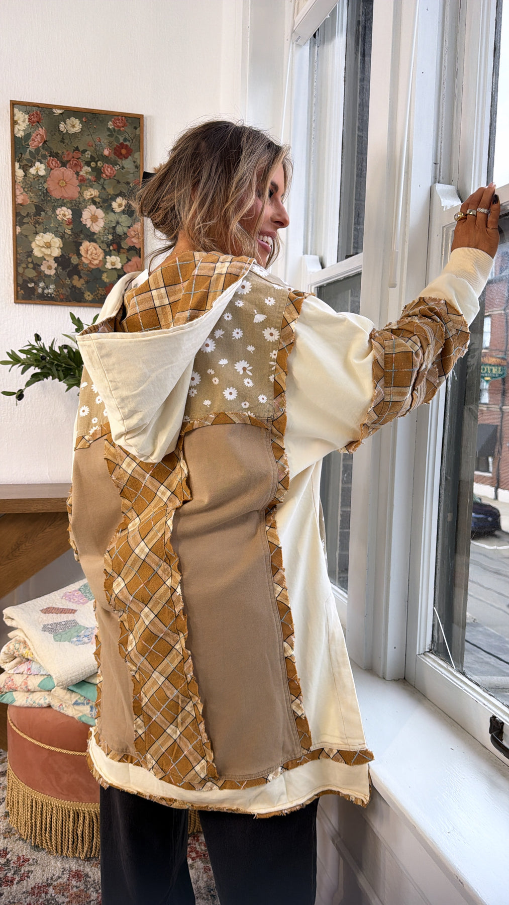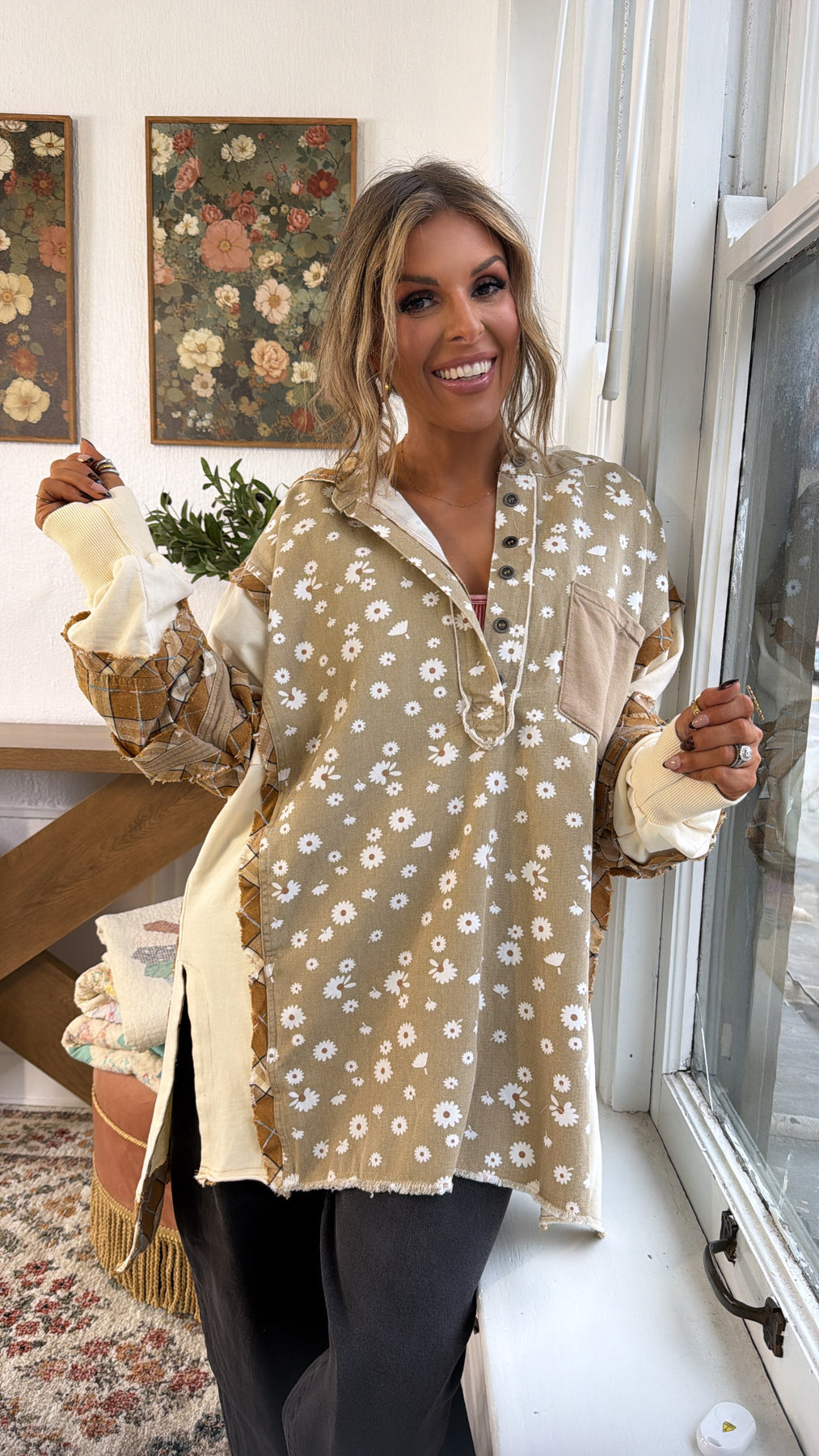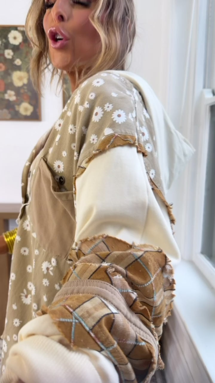 Soft, playful, and full of character the Daisy Lane Oversized Button Up is a feel good favorite you’ll reach for again and again. Featuring an allover daisy print on a warm neutral base, this top is elevated with mixed patchwork details, cozy contrast sleeves, and a relaxed oversized silhouette that drapes just right.