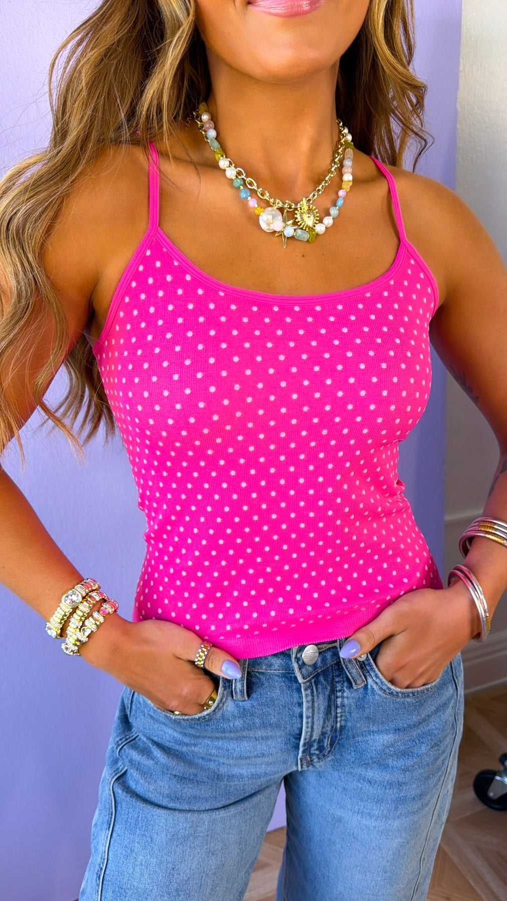 Bold, playful, and made to stand out. The Polka Dot Strap Cami in Aloha Fuchsia is your pop-of-color essential for sunny days and layered looks alike. Featuring a vibrant fuchsia base with delicate white polka dots, this piece brings the perfect mix of flirty and fun.