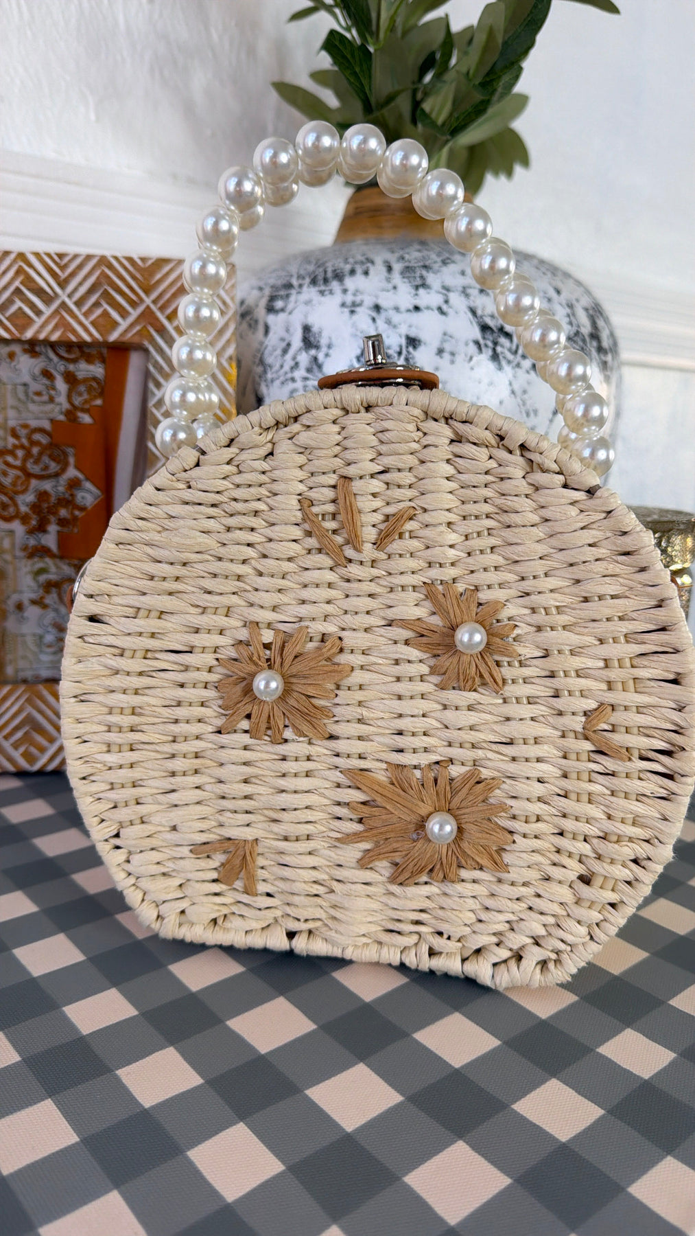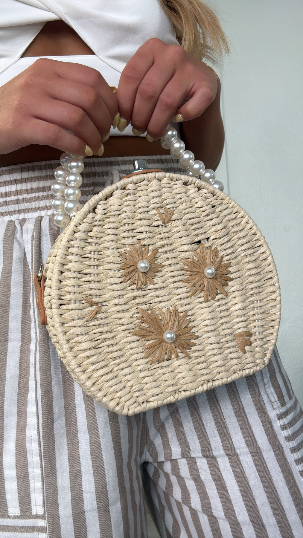 The Pearl Flower Handbag features a circular rattan style met with elegant pearl detailing throughout the strap and floral detailing within the design.