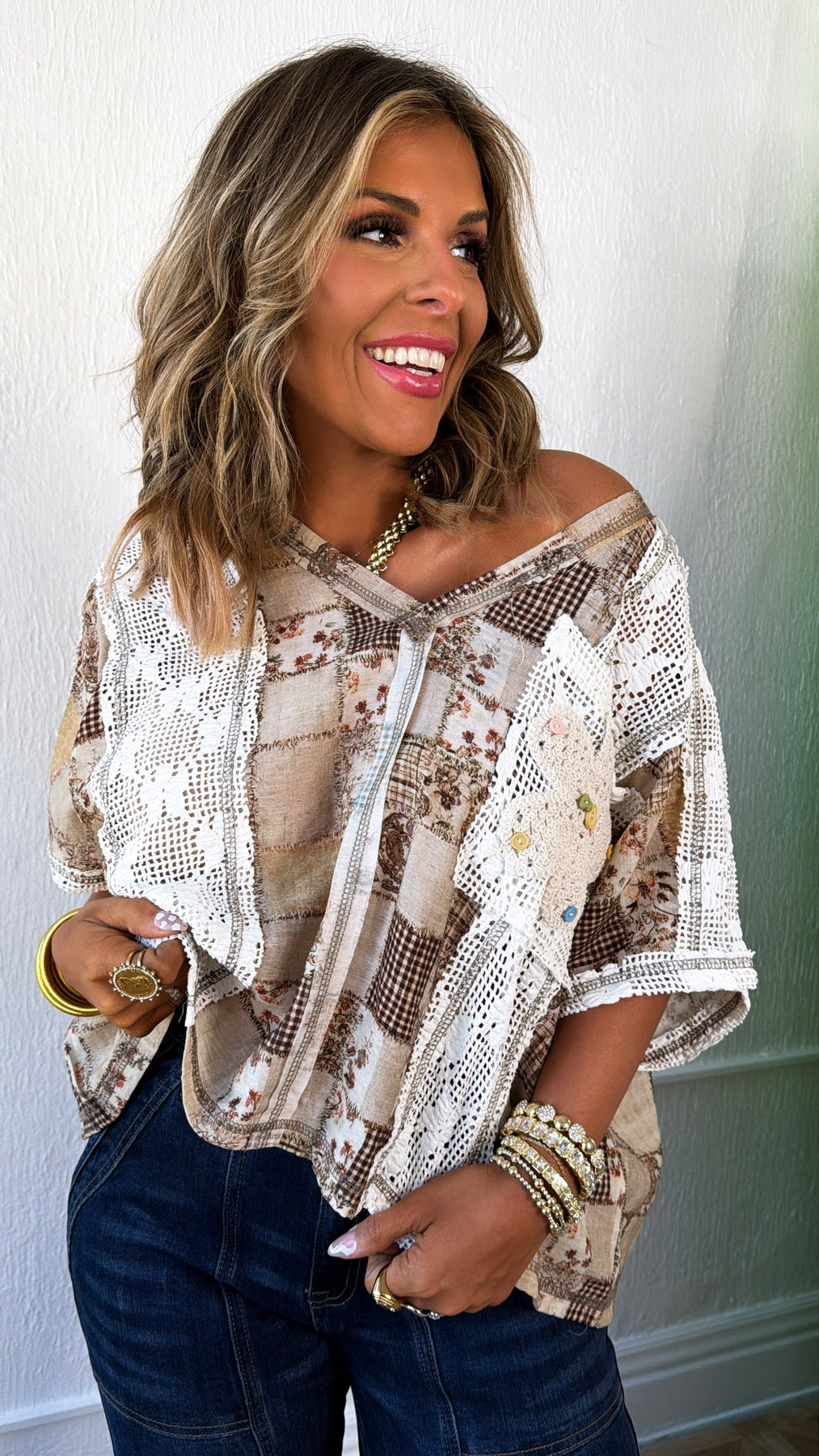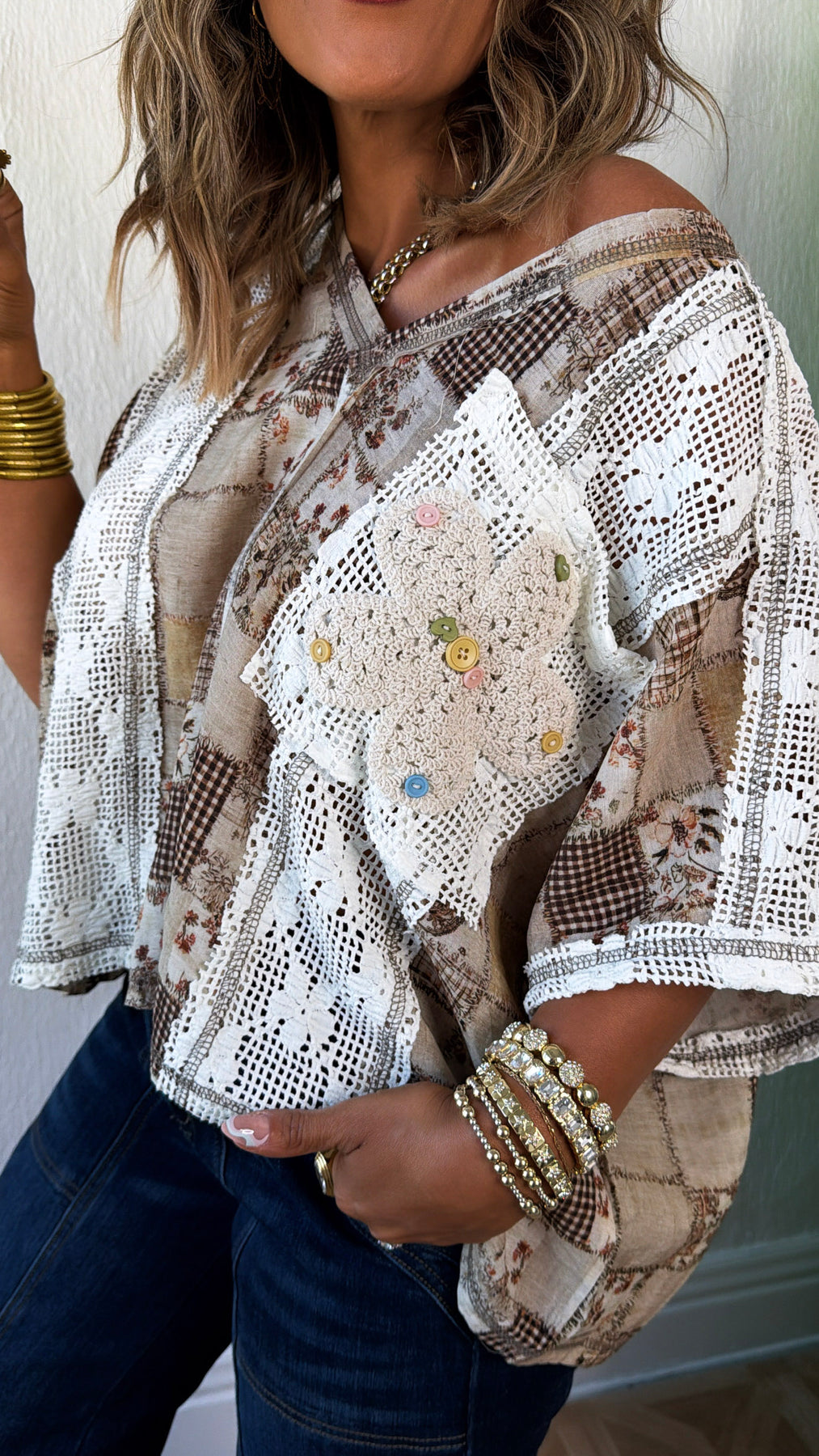 The relaxed, flowy silhouette pairs effortlessly with denim, while the crochet lace accents and whimsical button-detailed pocket add handcrafted character you don’t see every day. The wide neckline gives it that easy, laid-back drape that can be styled slightly off-shoulder for an extra touch of effortless charm.