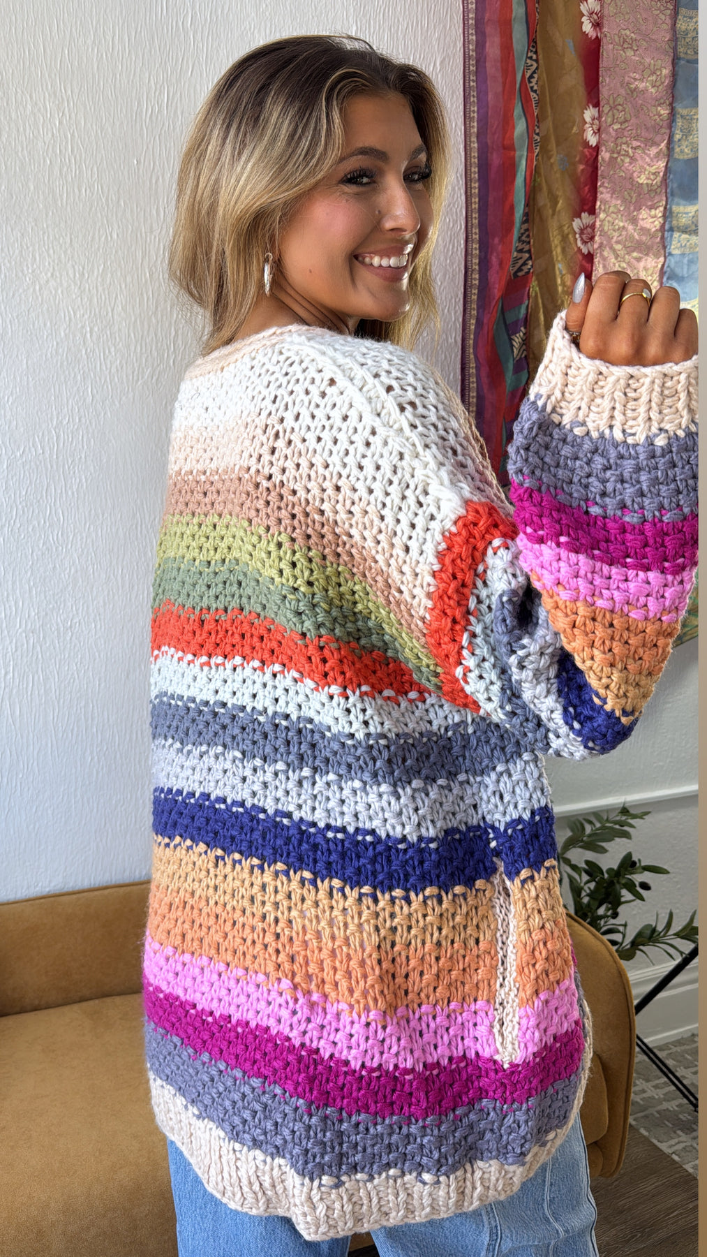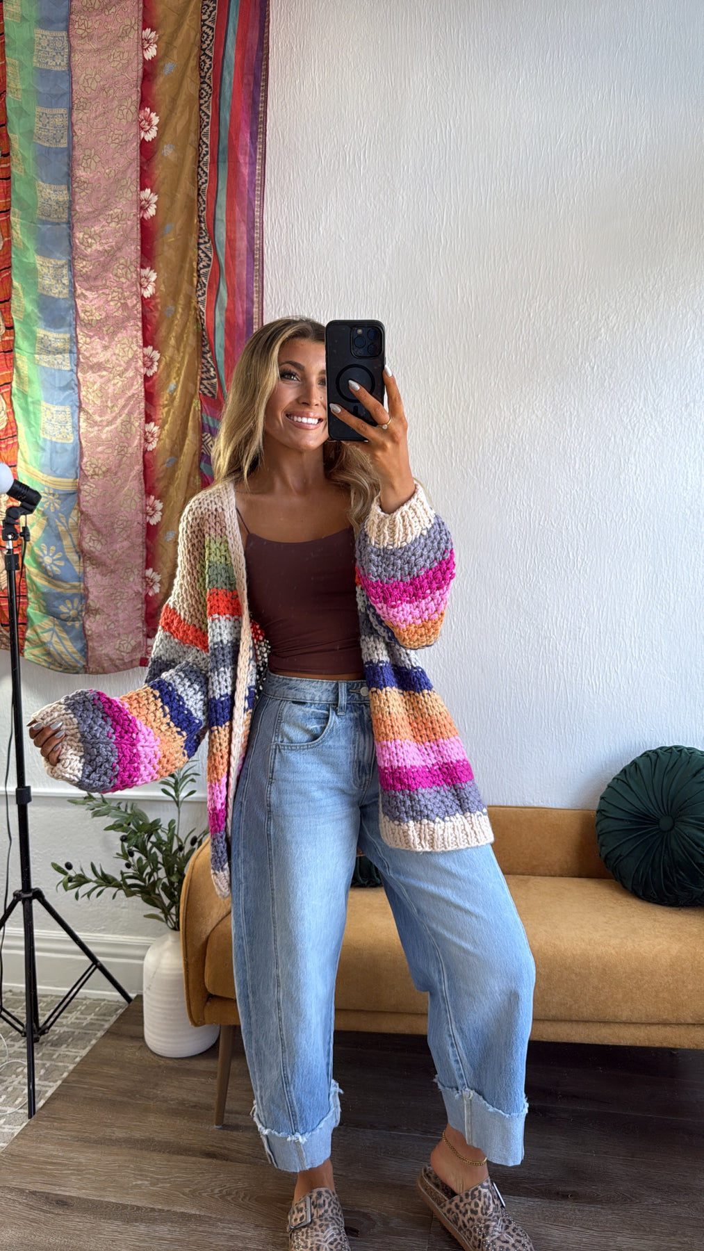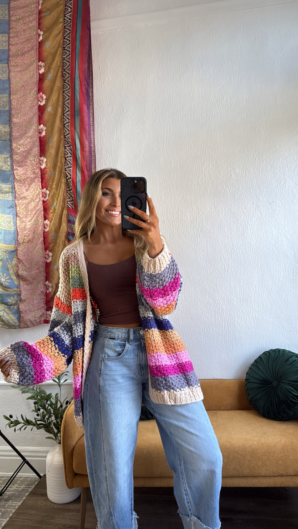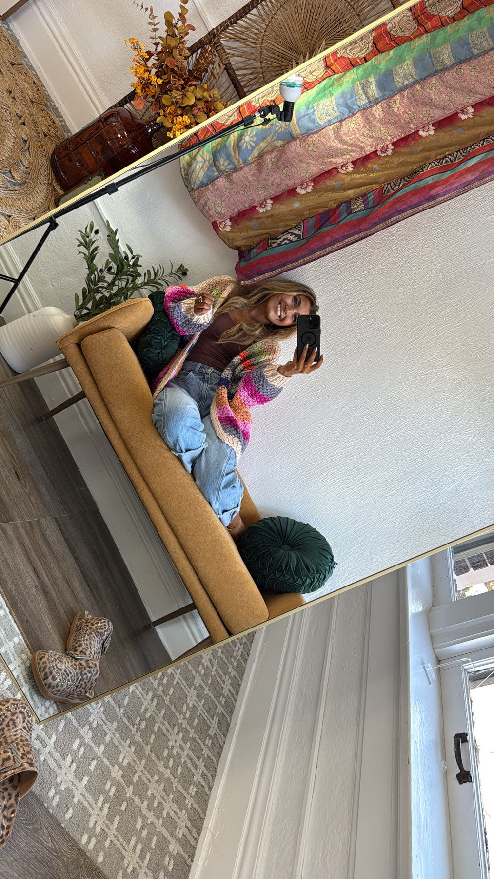 Wrap yourself in cozy elegance with our Hand Crochet Oversized Cardigan. The attention to detail in this piece is unmatched. This cardigan features intricate hand crocheting, that creates a unique and luxurious texture. The color story is rich and vibrant for the season, creating a vibrant glow. A beautiful- stand out piece!