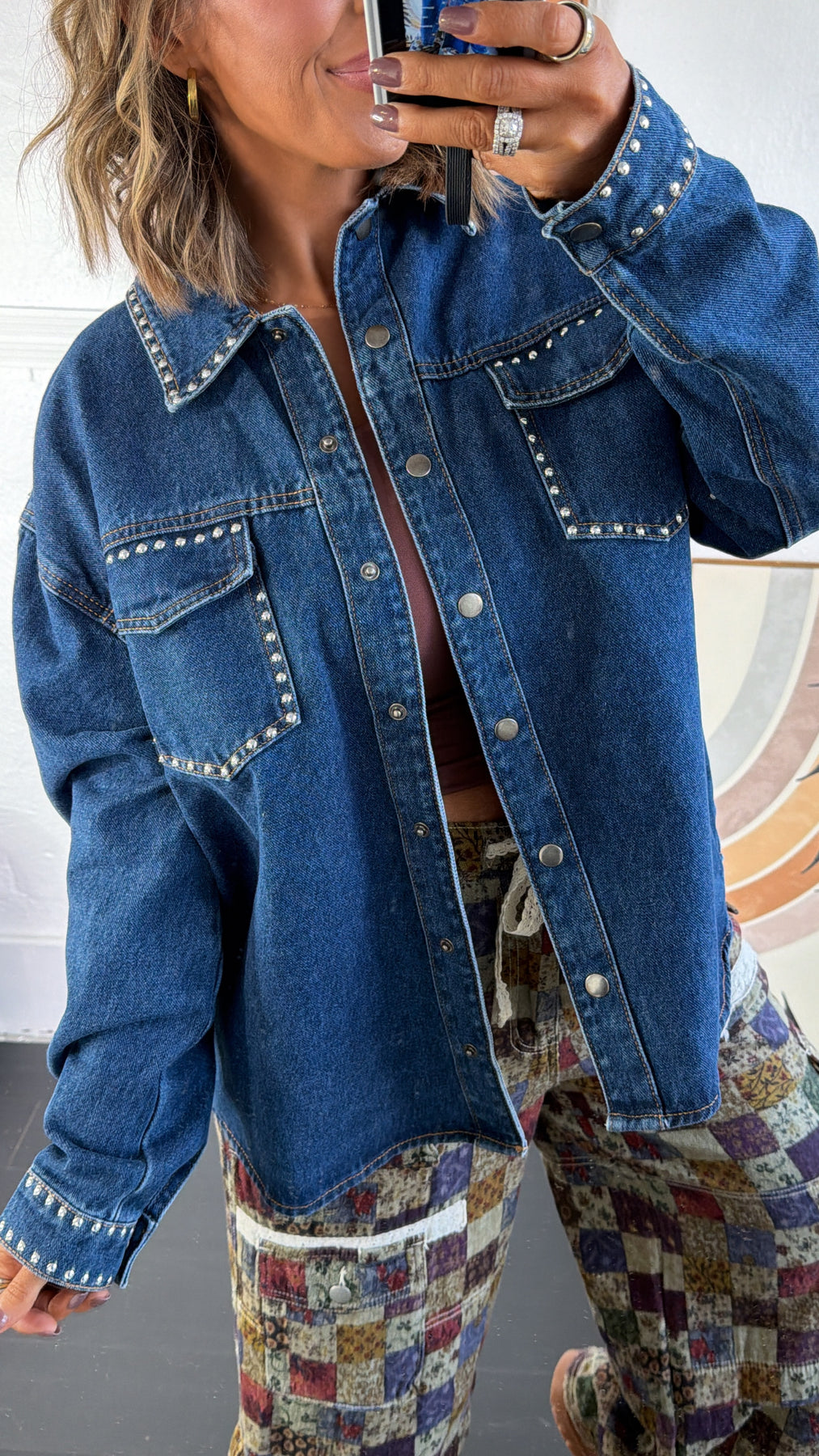 A classic denim staple with a bold western twist the Western Halo Studded Jacket is made to stand out. Featuring silver stud detailing along the collar and chest pockets, this jacket brings just the right amount of edge while keeping a timeless, wearable feel. The relaxed fit makes it perfect for layering, whether worn buttoned up or styled open over your favorite basics.