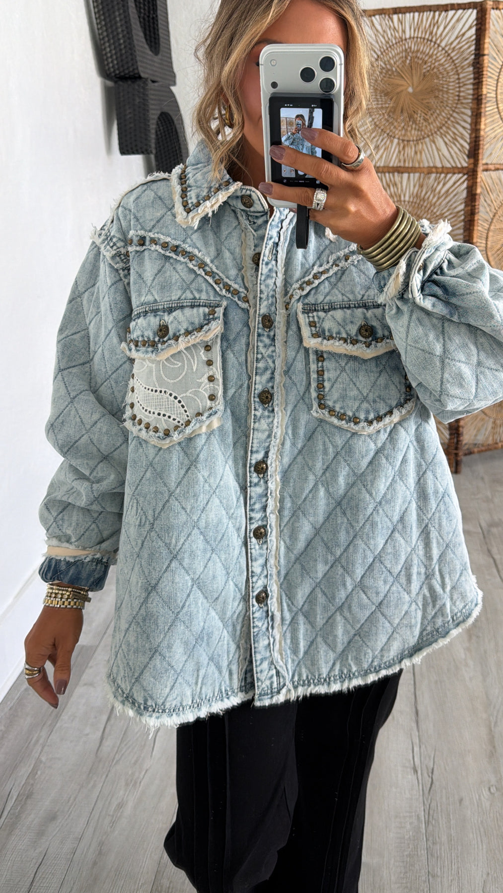 Soft structure meets feminine detail in the Wild Blooms Quilted Jacket. Crafted in a light-wash denim with an allover quilted texture, this statement jacket is elevated with delicate lace accents, vintage inspired buttons, and subtle stud detailing. The relaxed, slightly oversized fit makes it perfect for layering while still feeling polished and intentional.
