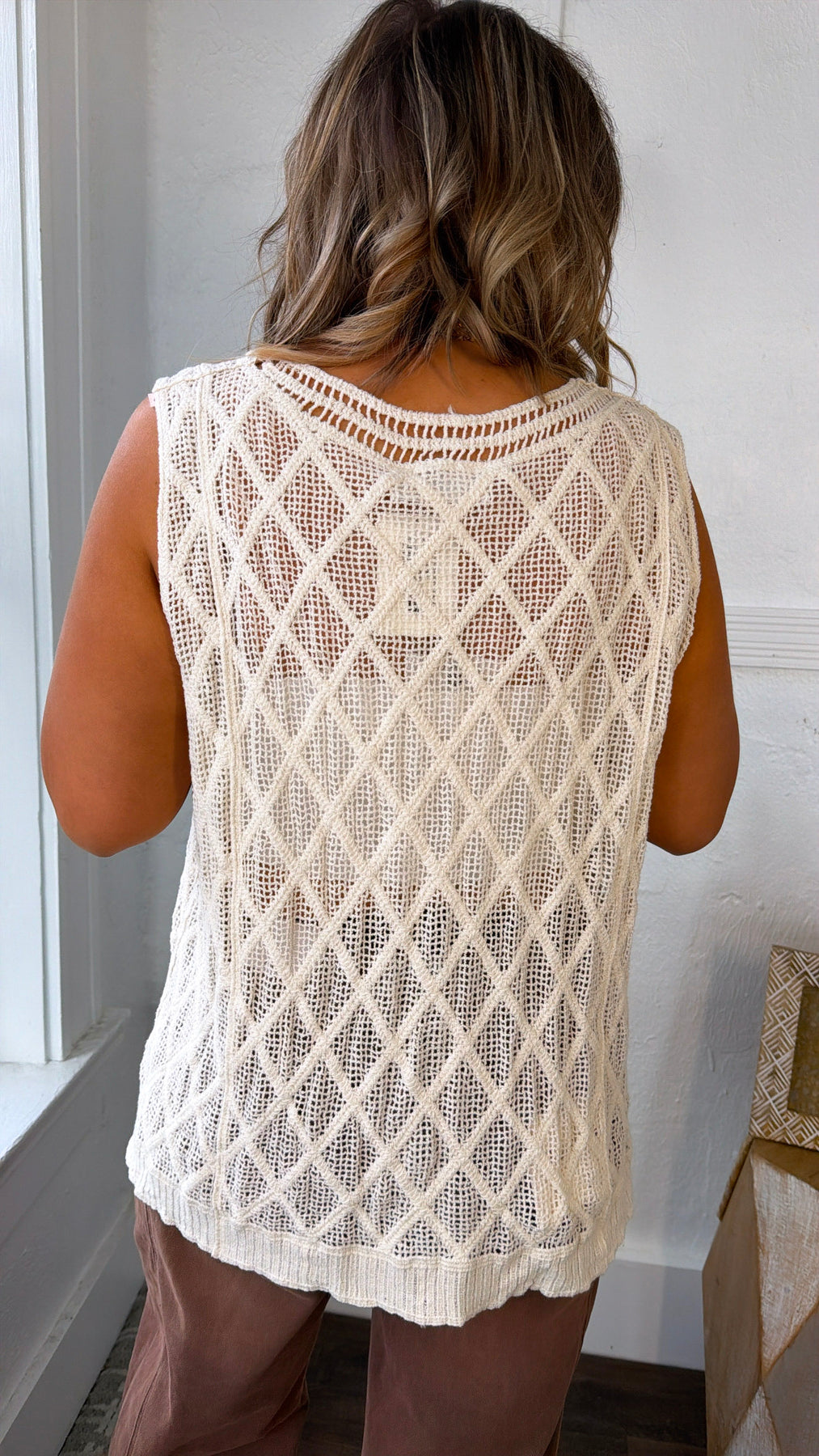 Lightweight, airy, and effortlessly chic — the Cotton Cloud Sweater Tank is the perfect layering piece for every season. Designed with a soft open-knit texture and relaxed silhouette, this sweater tank brings cozy comfort with a breezy feel. The beautiful natural color makes it an easy neutral that pairs perfectly with denim, trousers, or layered over your favorite tanks and bralettes.