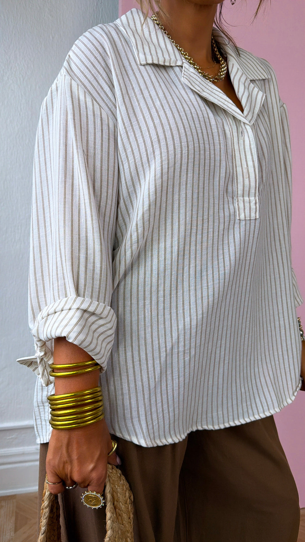 Effortlessly relaxed with a polished touch, the Hazel Latte Button Down is the perfect blend of casual comfort and timeless style. Designed with soft mocha pinstripes on a creamy white base, this blouse brings a neutral palette that pairs beautifully with just about anything. The relaxed silhouette, classic collar, and partial button front make it an easy piece to style for everyday wear.
