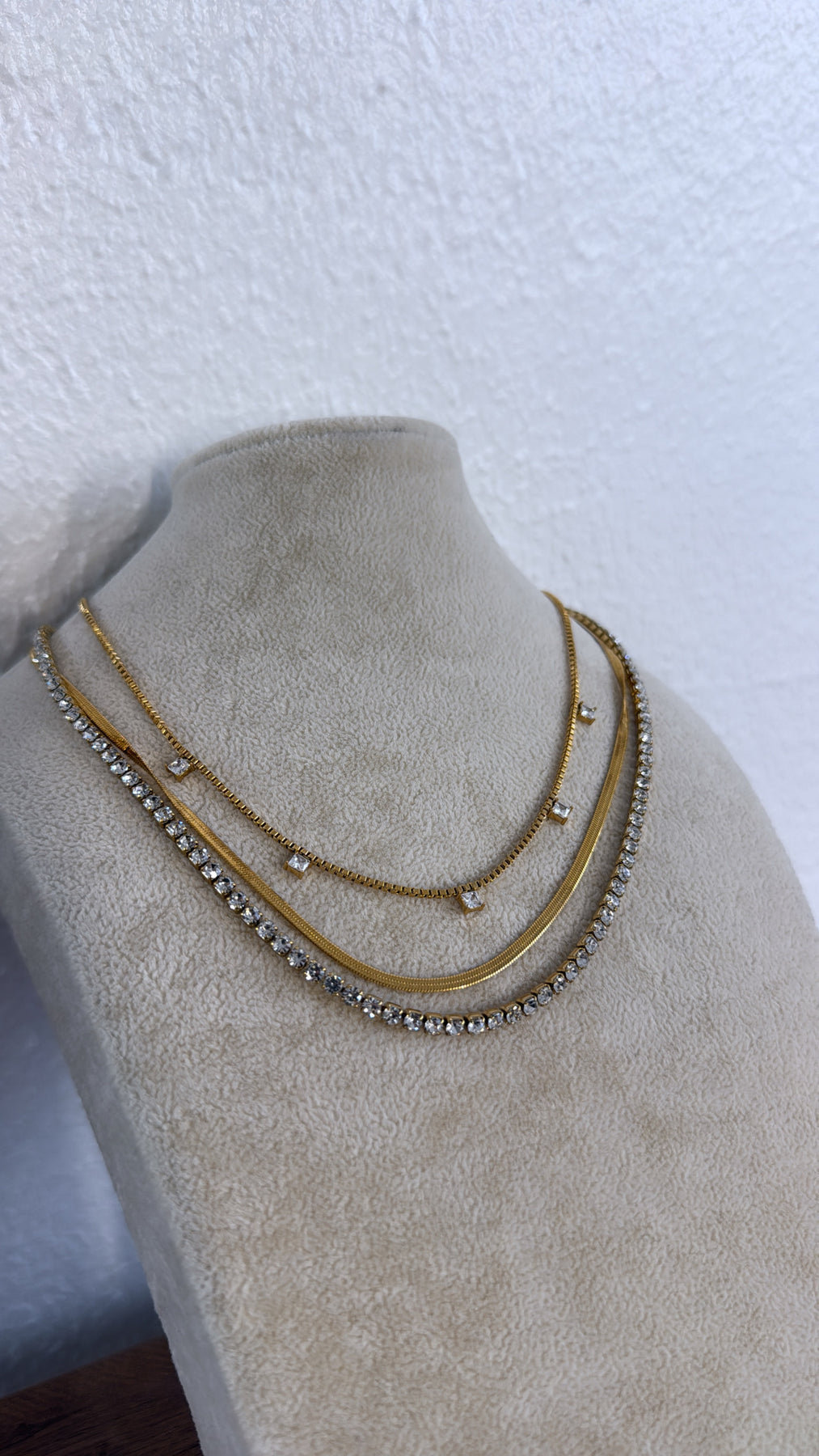 The perfect accessory to add to your look! Three tier gold necklace with crystal embellishments