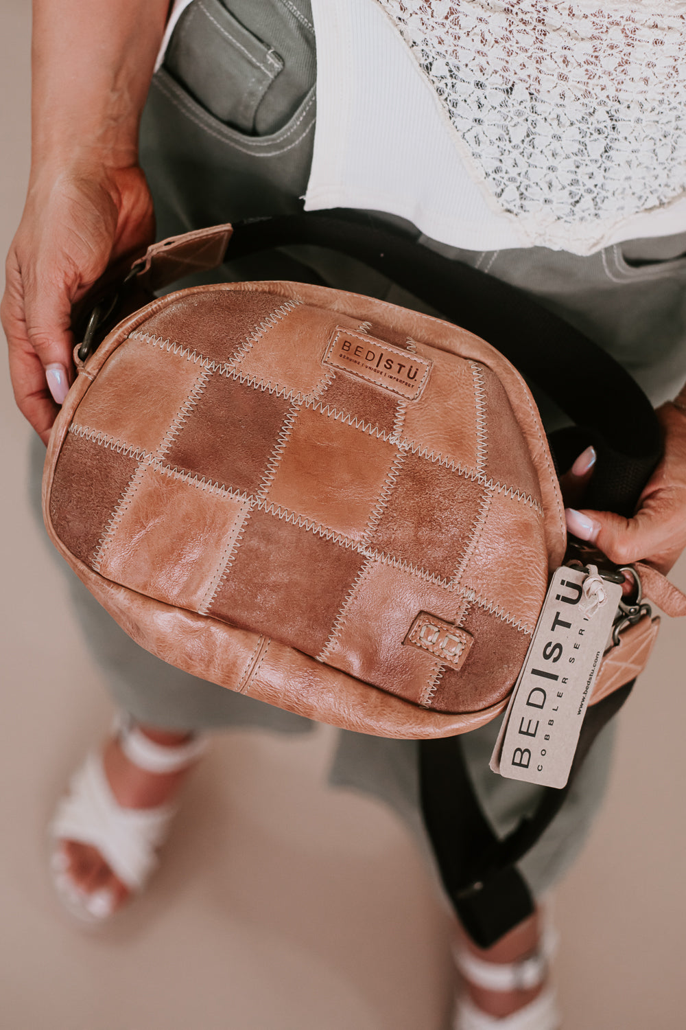 • Unique scrap leather patchwork front, promising no waste at the factory level