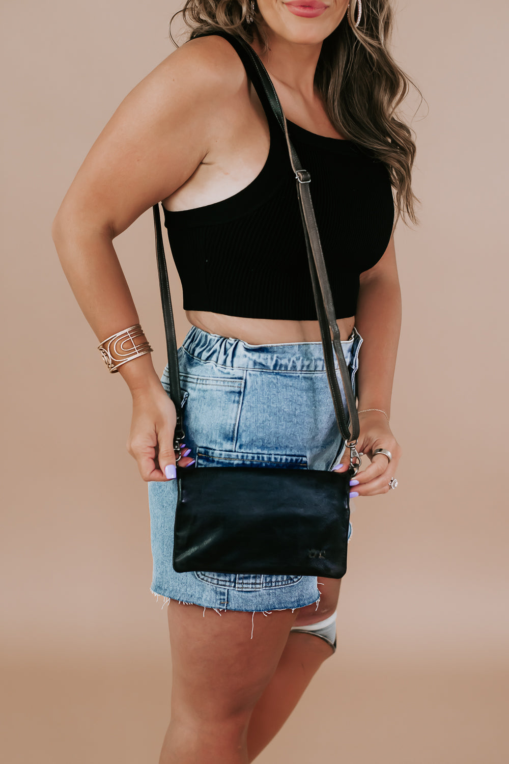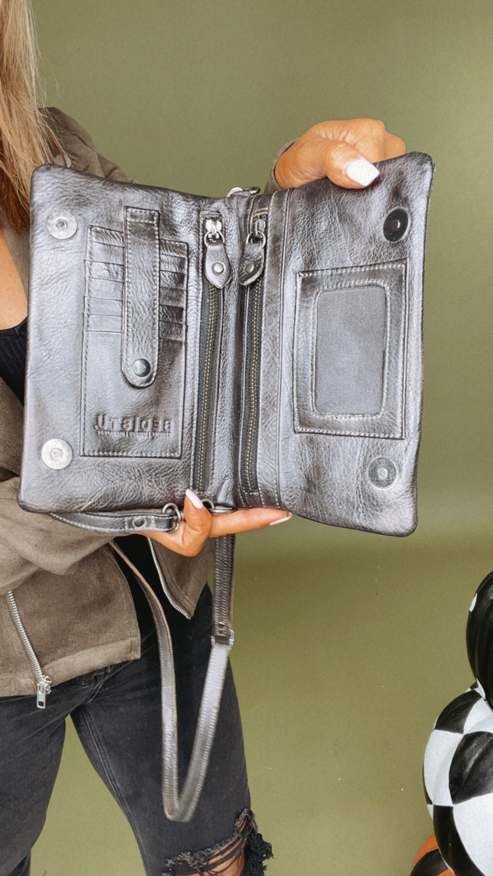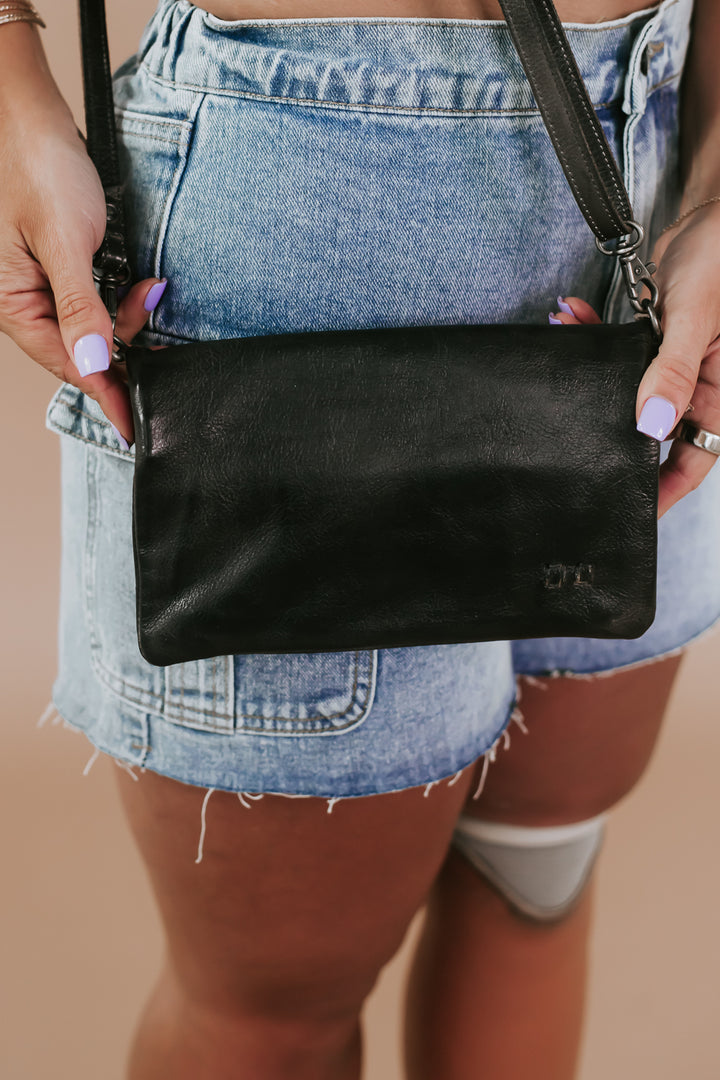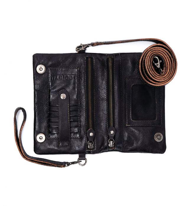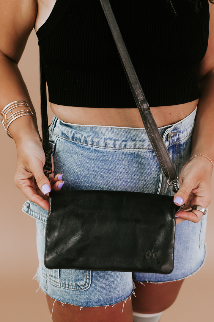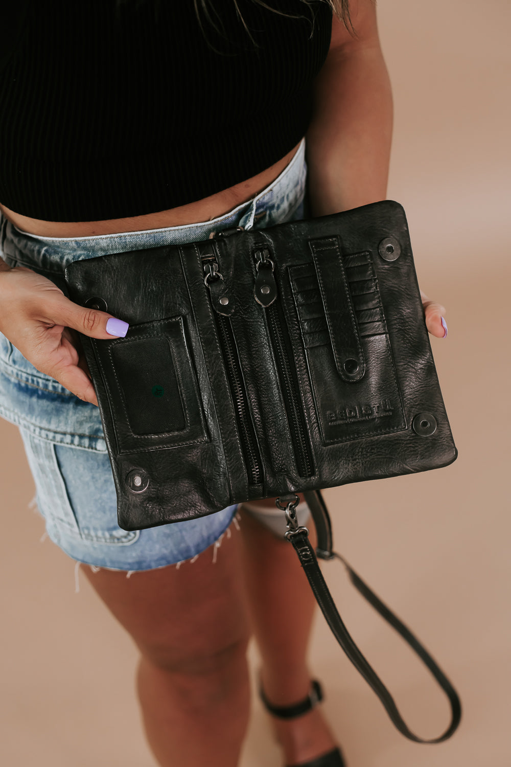 CADENCE in black rustic is a must-own for every modern woman. Wear this compact leather accessory as a wallet, cross-body, or clutch! Essential for hands-free adventures, CADENCE offers two secure inner zipper pockets, a place for ID & credit cards, and a metal magnet closure.
