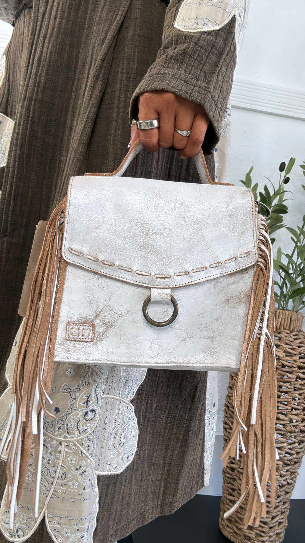 - Functional flap opening with heavy hardware buckle closure
