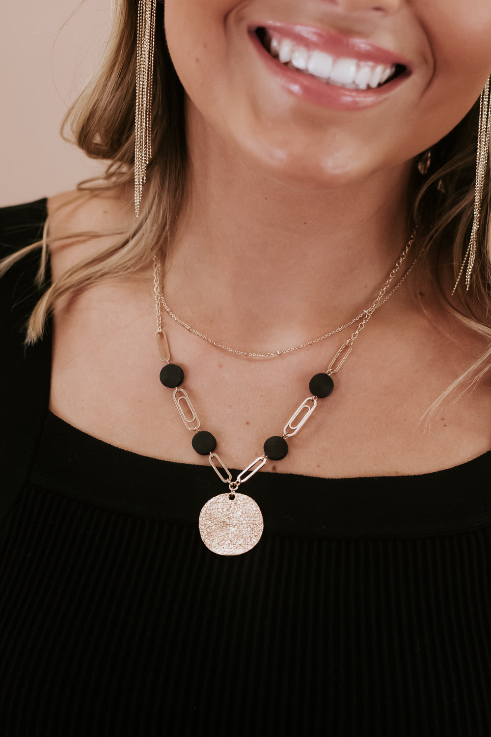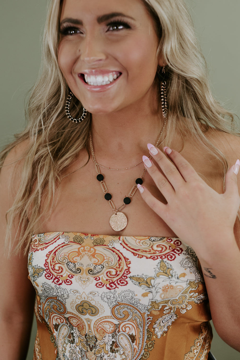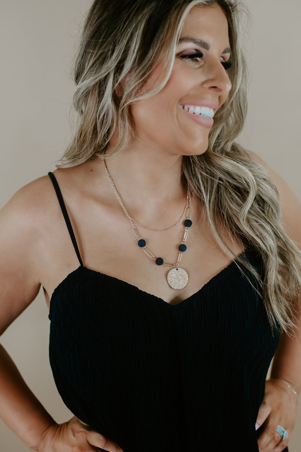 The Chasing Sunsets Layered Necklace features a layered style design met with gold detailing throughout, and an adjustable clasp closure.