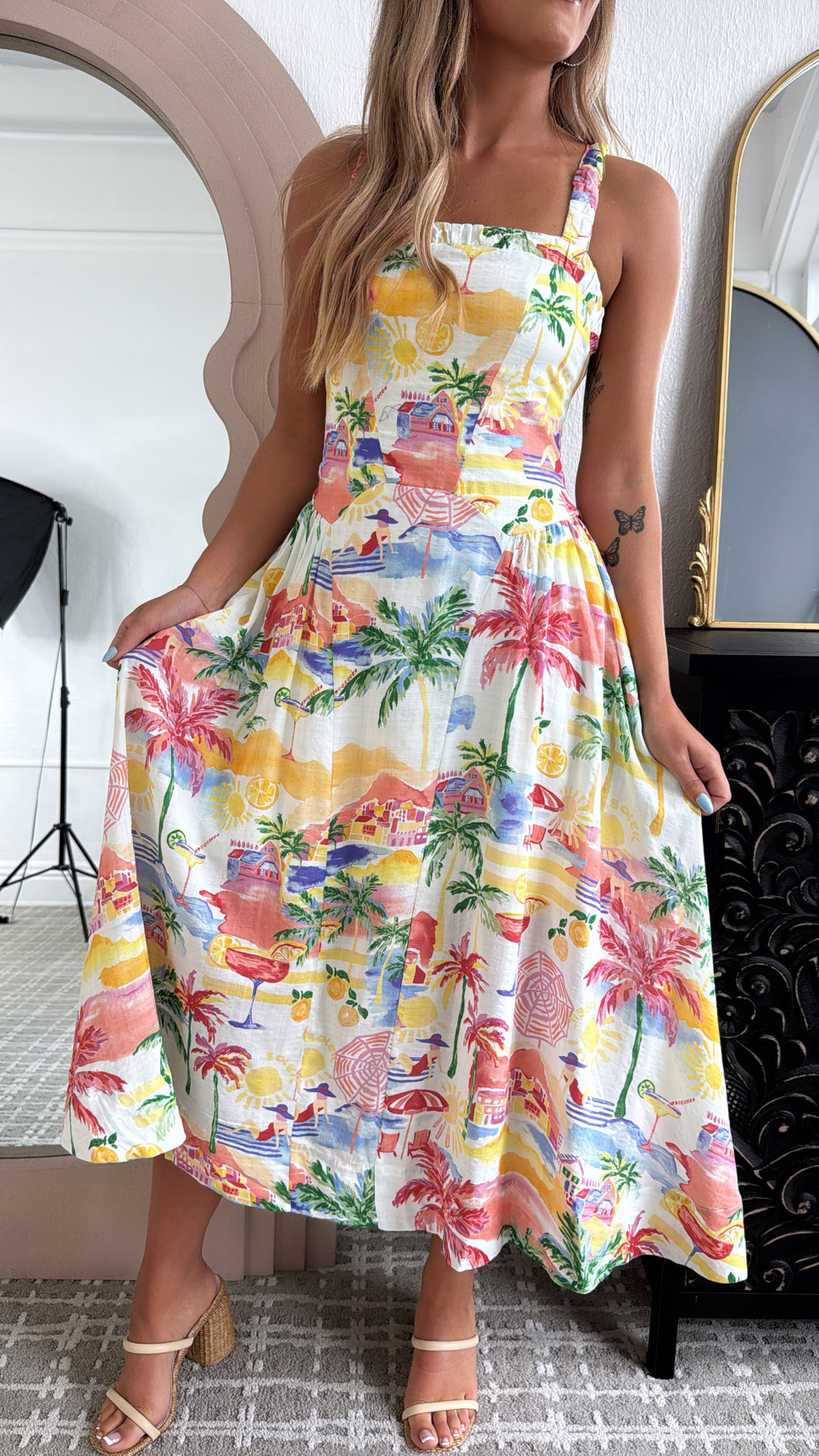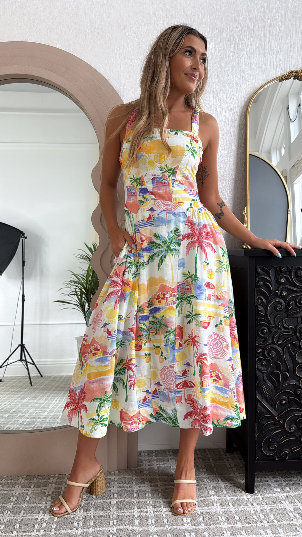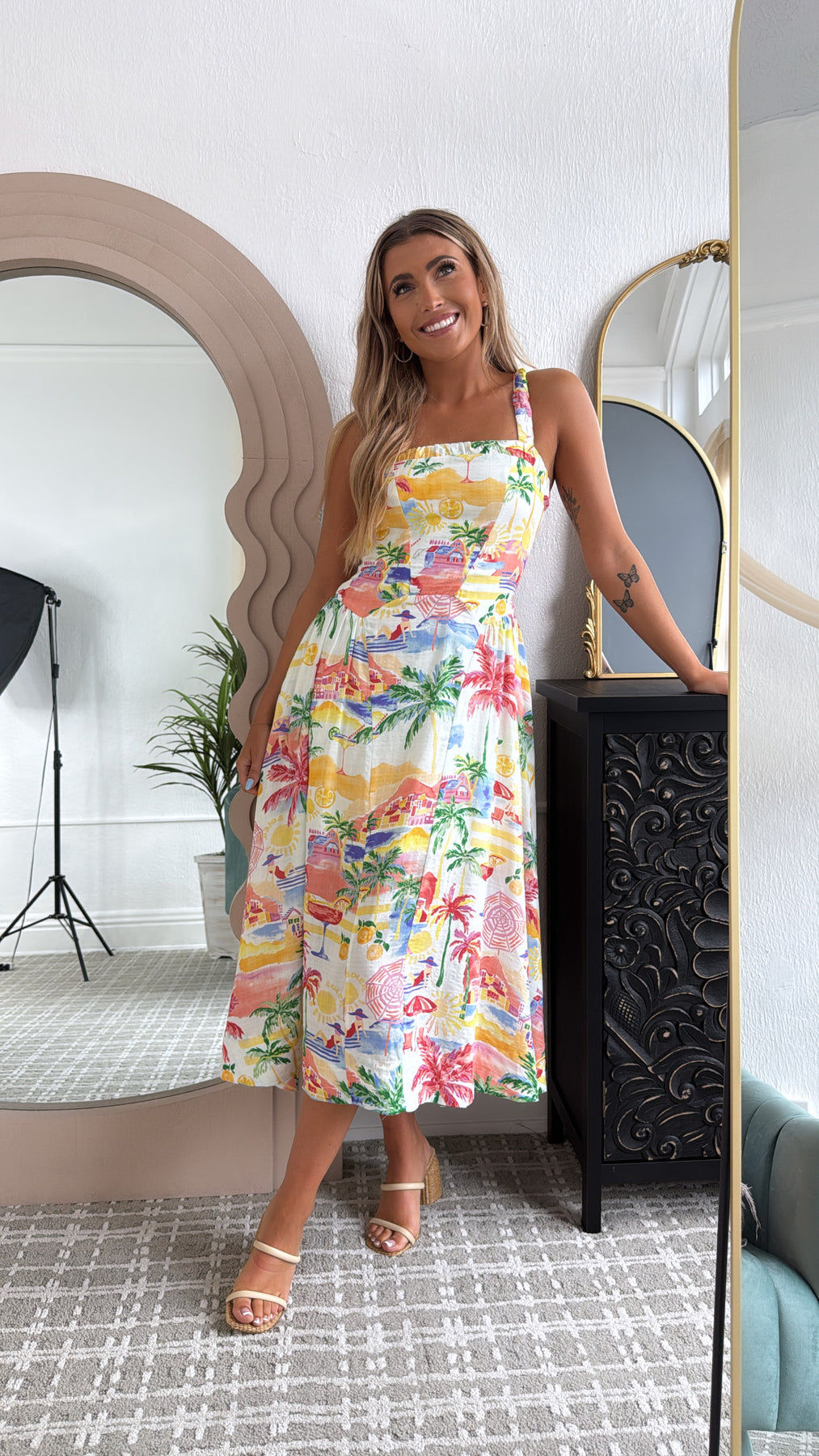 Elevate your summer wardrobe with our Coastal Vines Midi Dress. This stunning dress features a vibrant tropical print, exuding a relaxed and carefree vibe. With its breezy silhouette and comfortable fit, you'll feel effortlessly chic and stylish wherever you go.