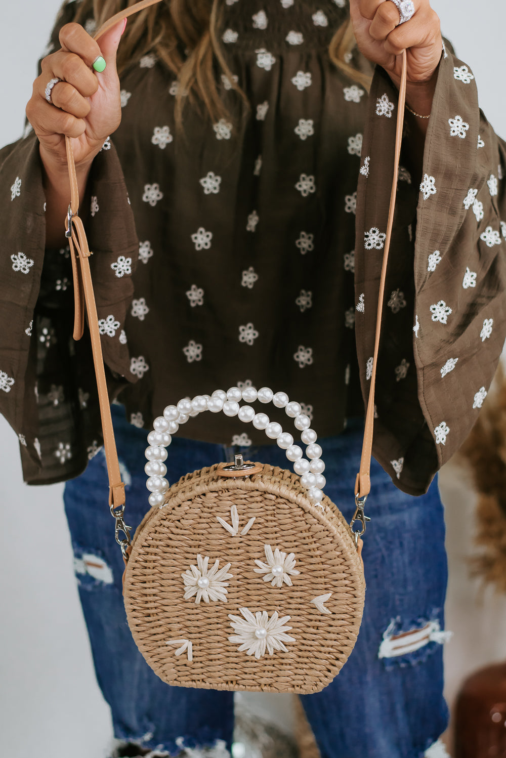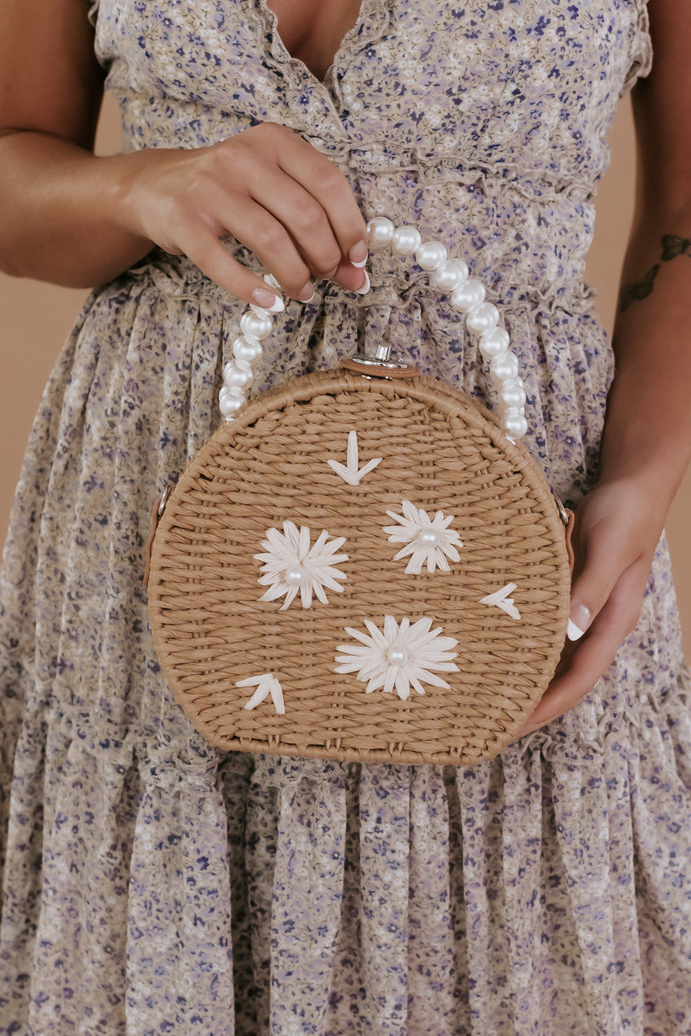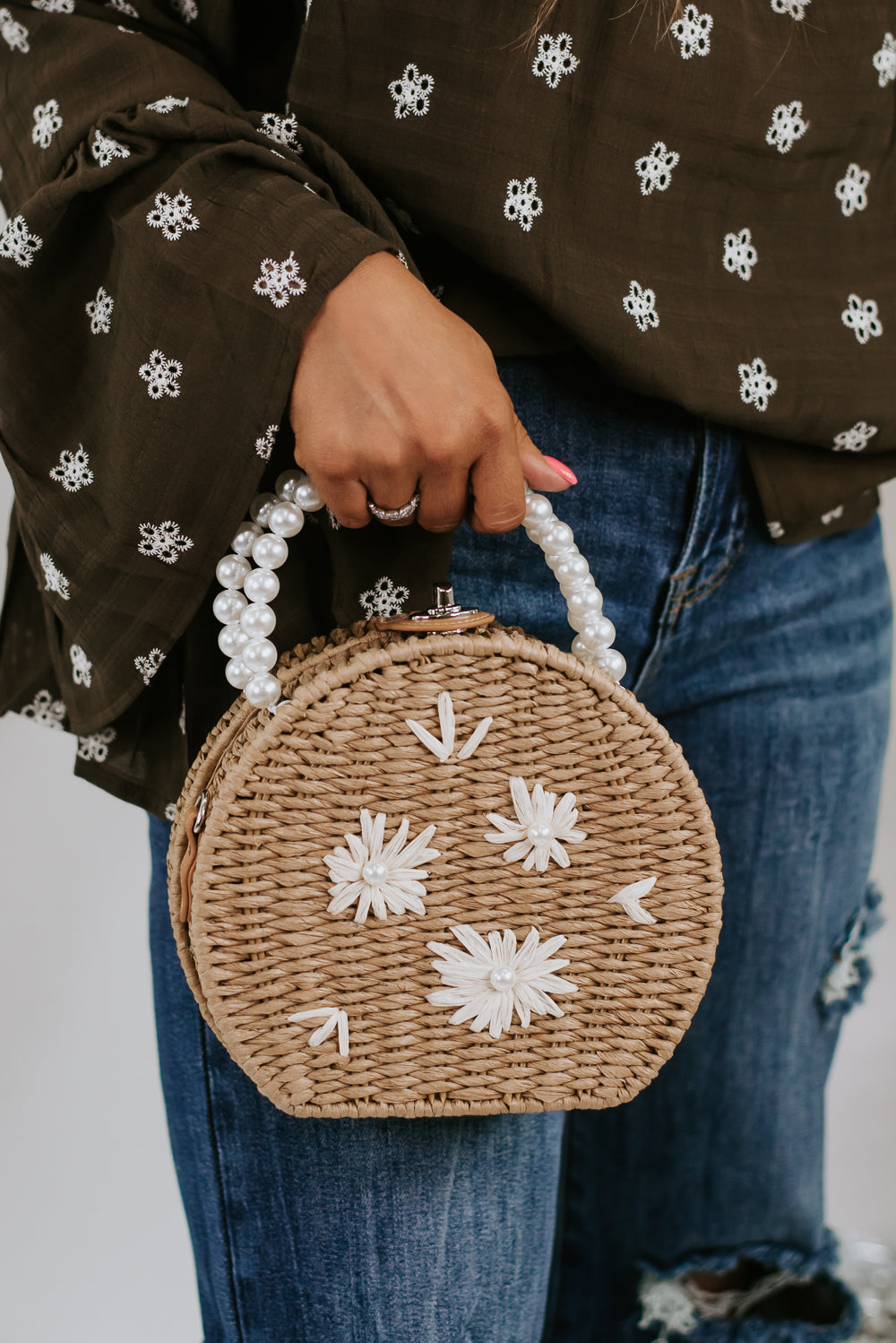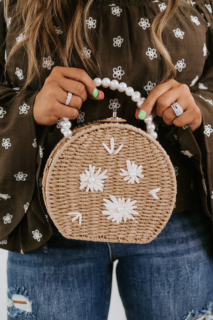 The Pearl Flower Handbag features a circular rattan style met with elegant pearl detailing throughout the strap and floral detailing within the design.