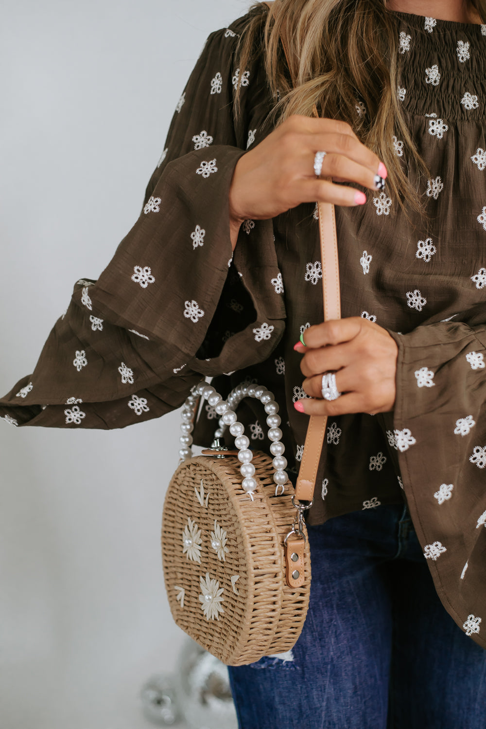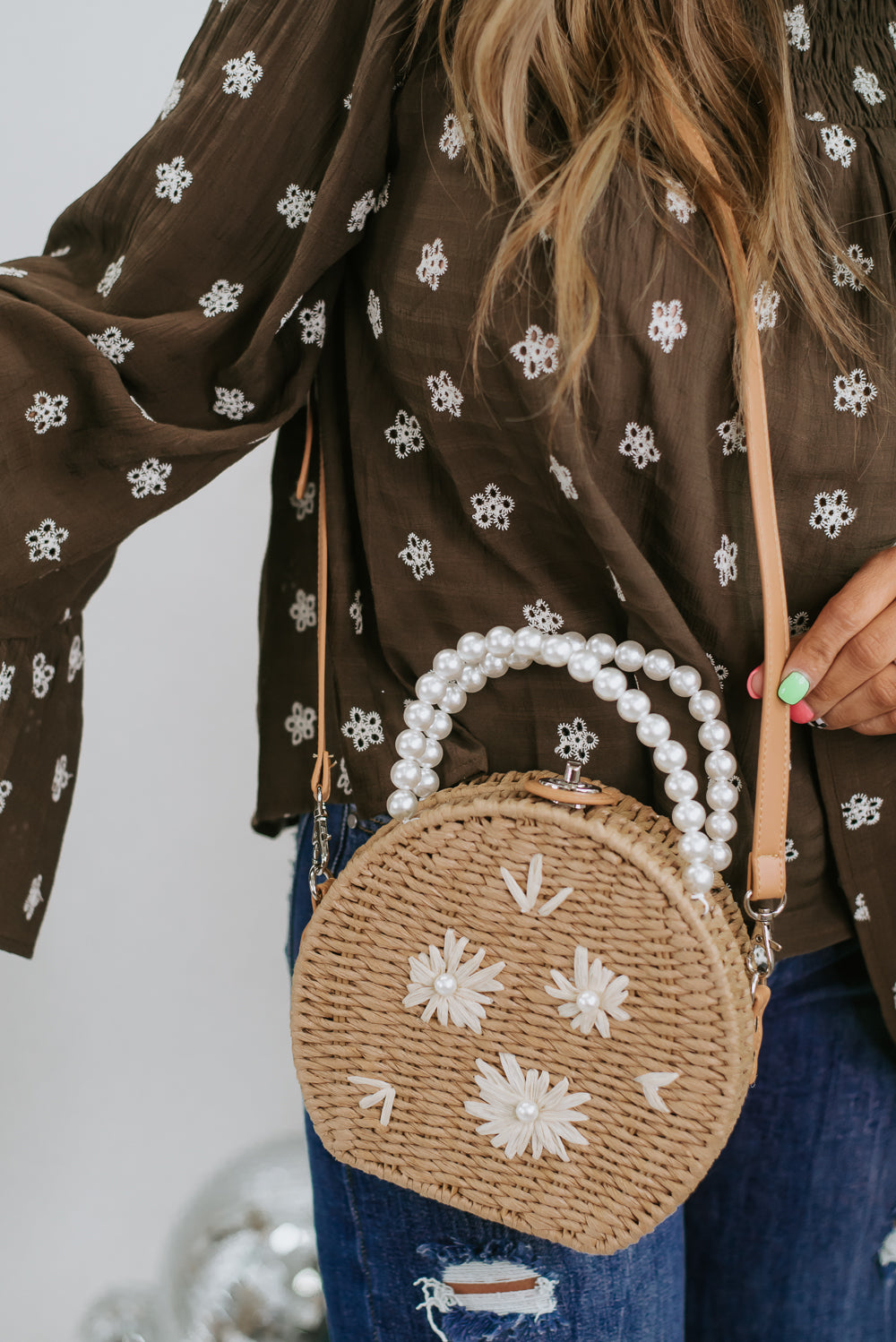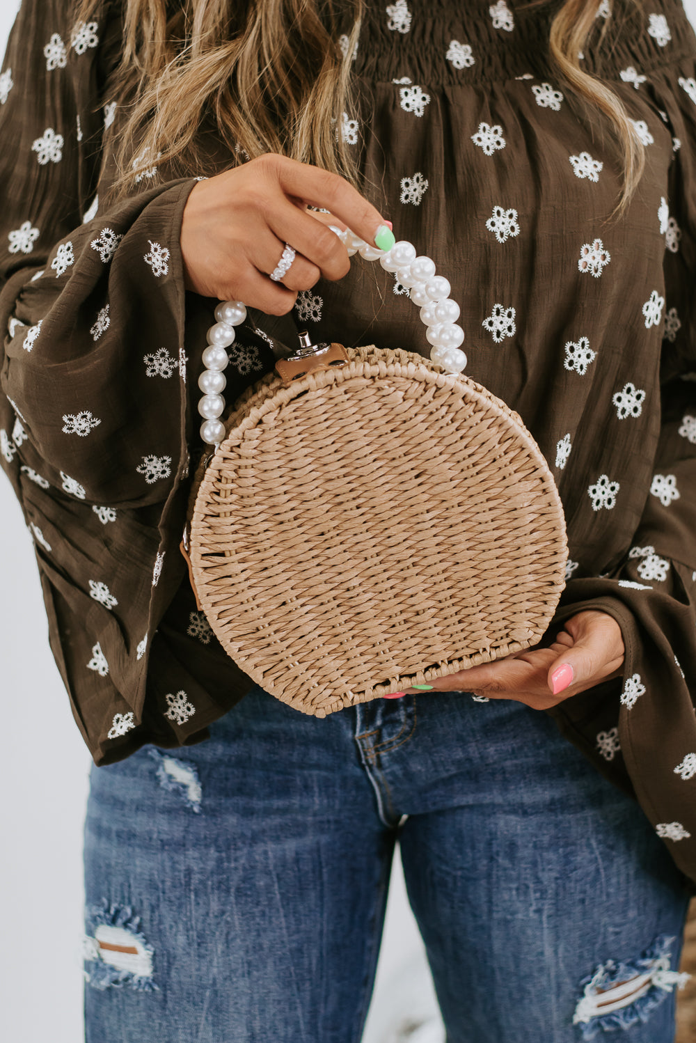 The Pearl Flower Handbag features a circular rattan style met with elegant pearl detailing throughout the strap and floral detailing within the design.