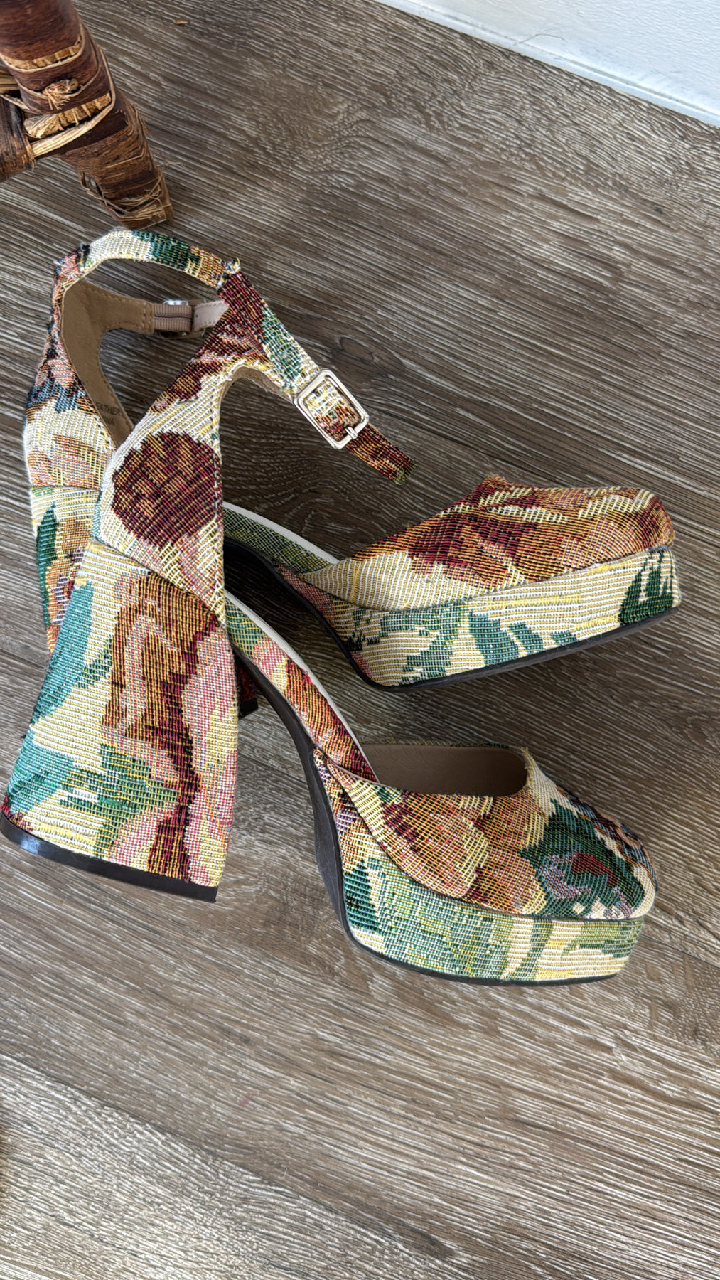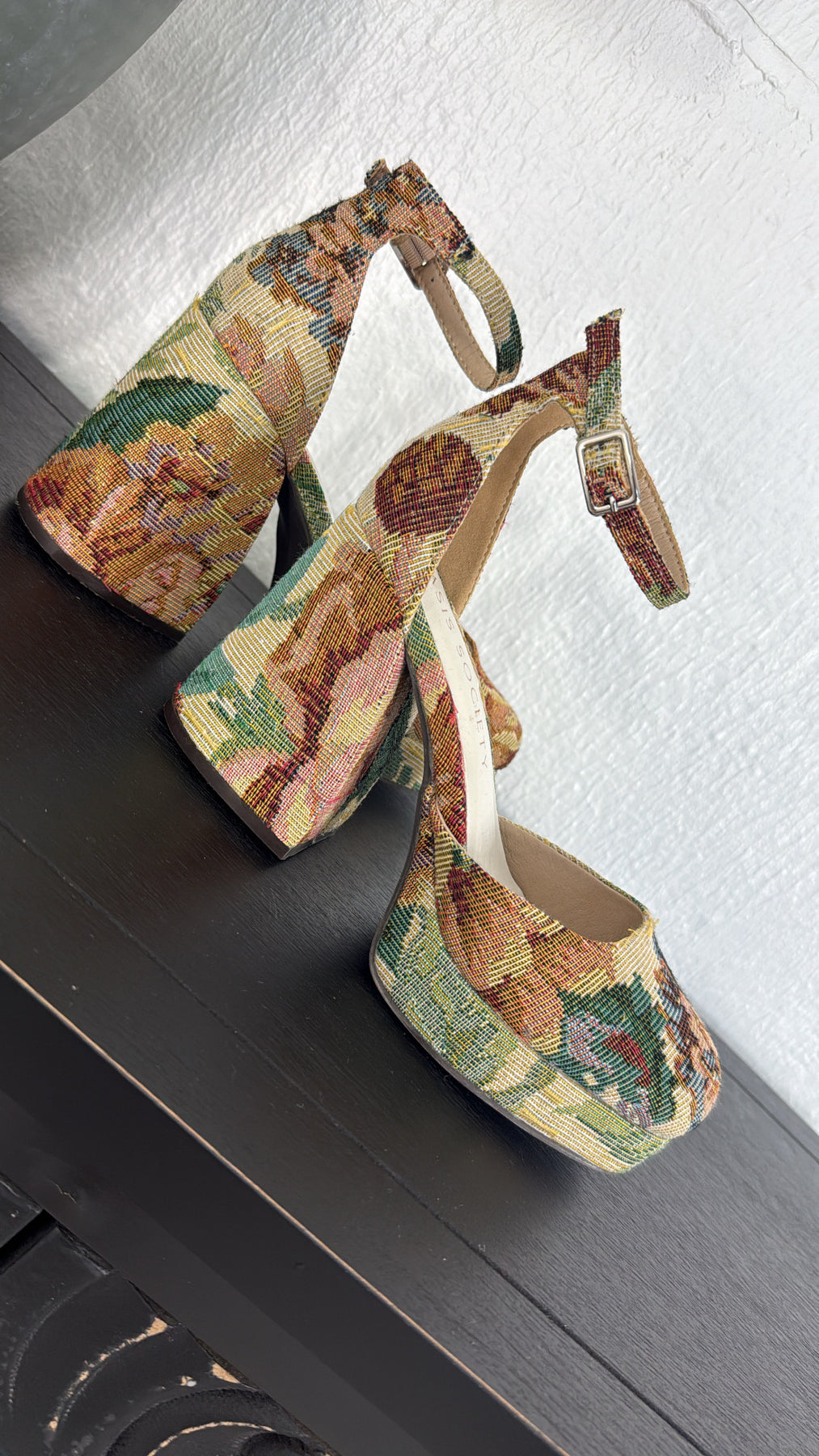 The Delilah Tapestry Floral Chunky Platform Heel truly elevates any look. Featuring an ultra-comforting platform style, adjustable buckle strap, and true-to-size fit.