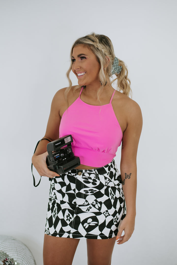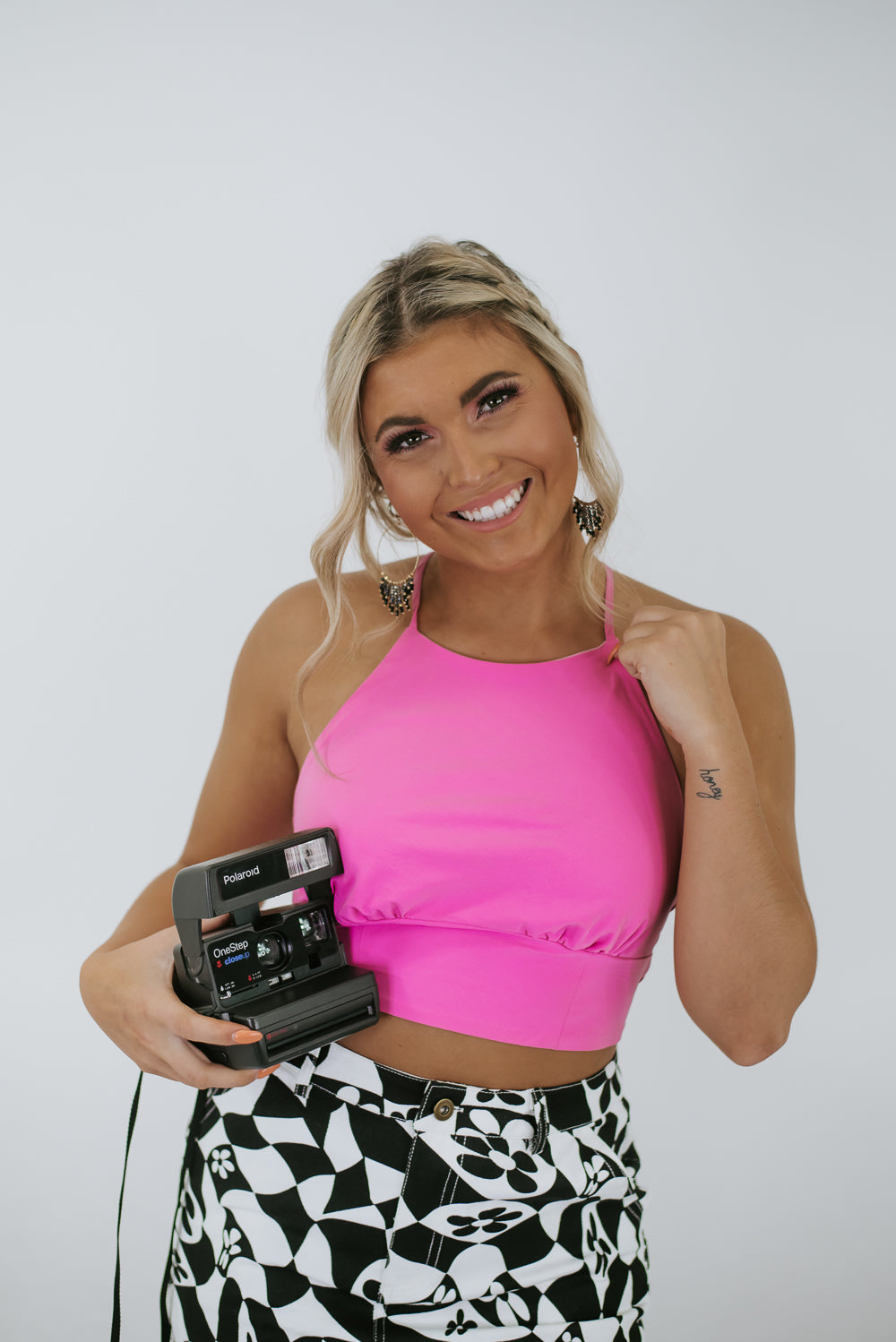 Make an elevated statement in this trend-focused top! Featuring an adjustable tie-up open back detail, cropped fit, and slimming rounded neckline.