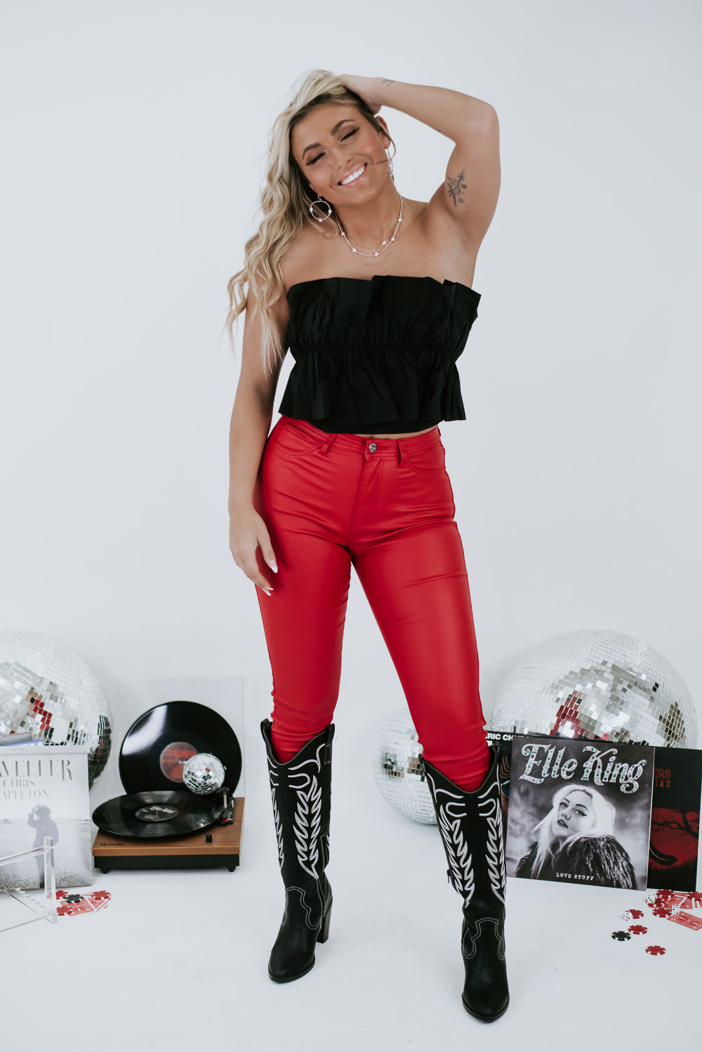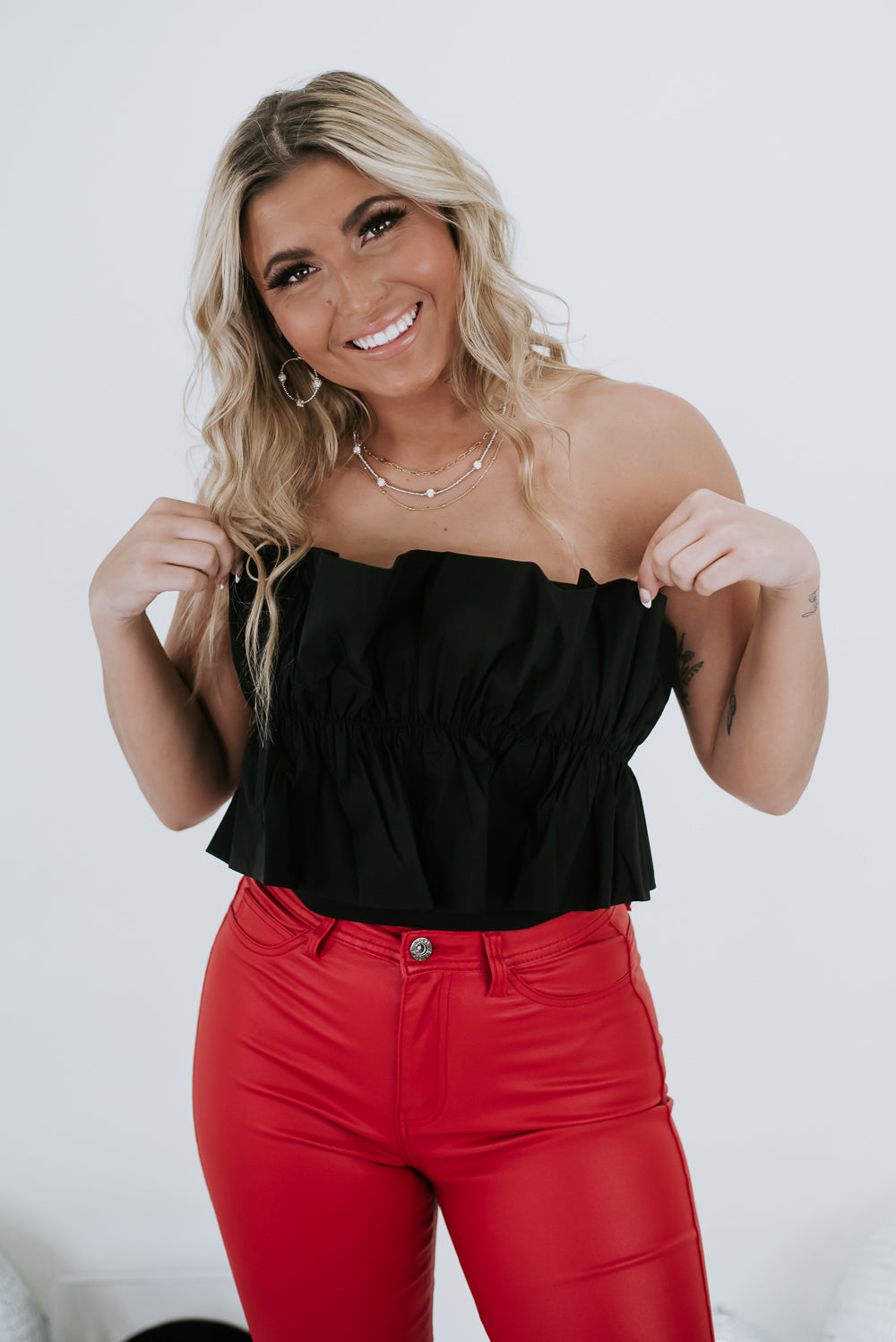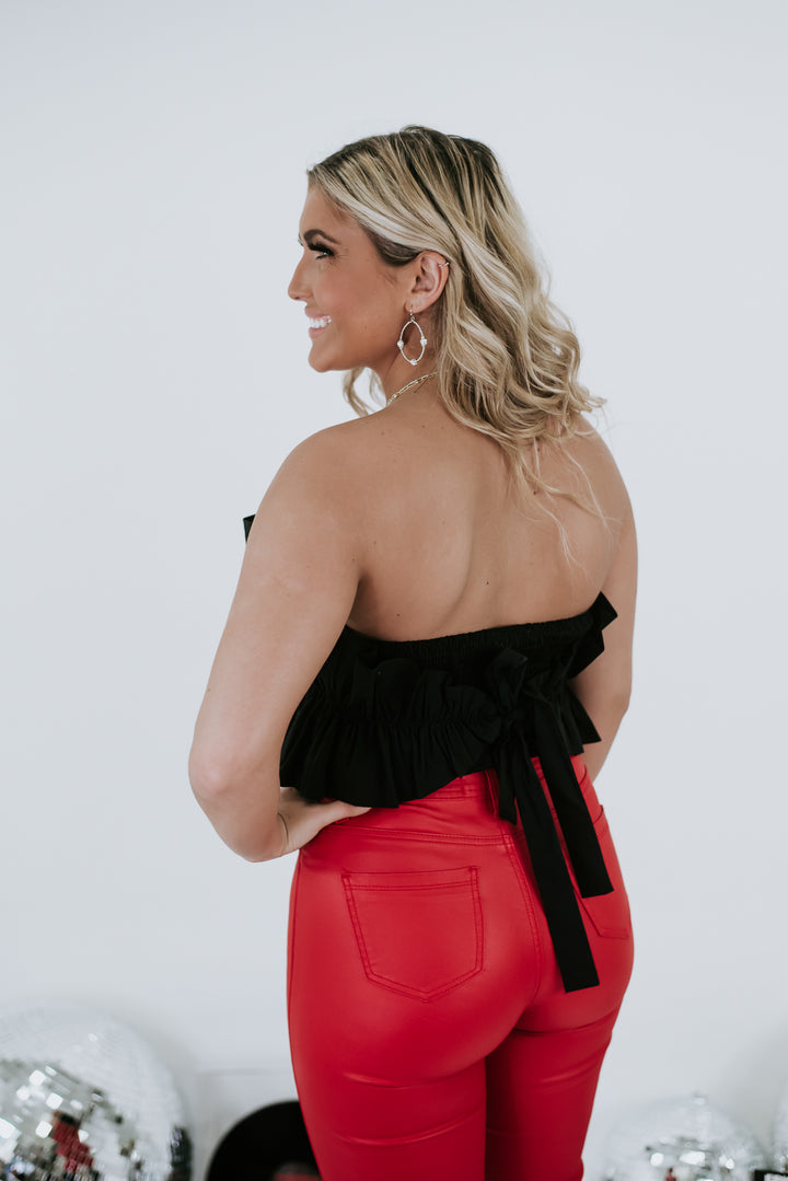 The Taking The Town Top is the perfect addition to your wardrobe. You will look timeless and elegant with a cropped fit and ruffled bodice. The smocked back and adjustable tie-back add extra comfort while keeping your look sophisticated.