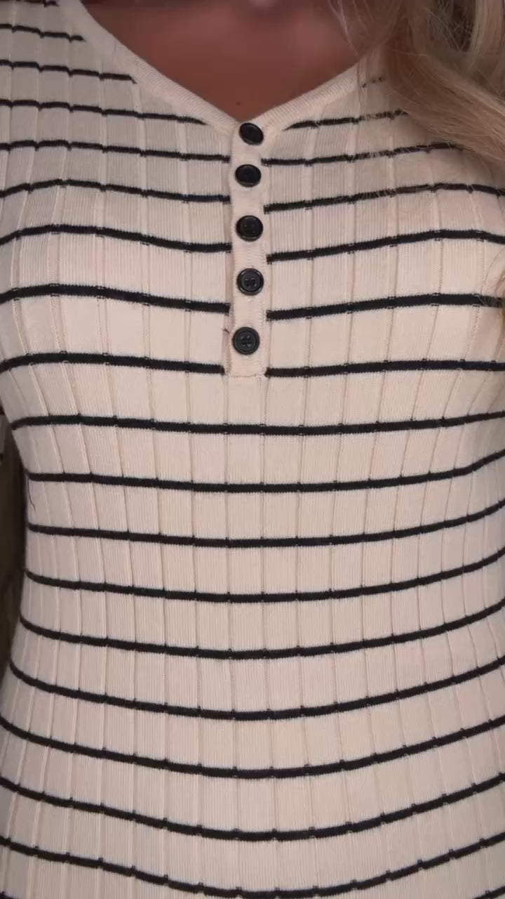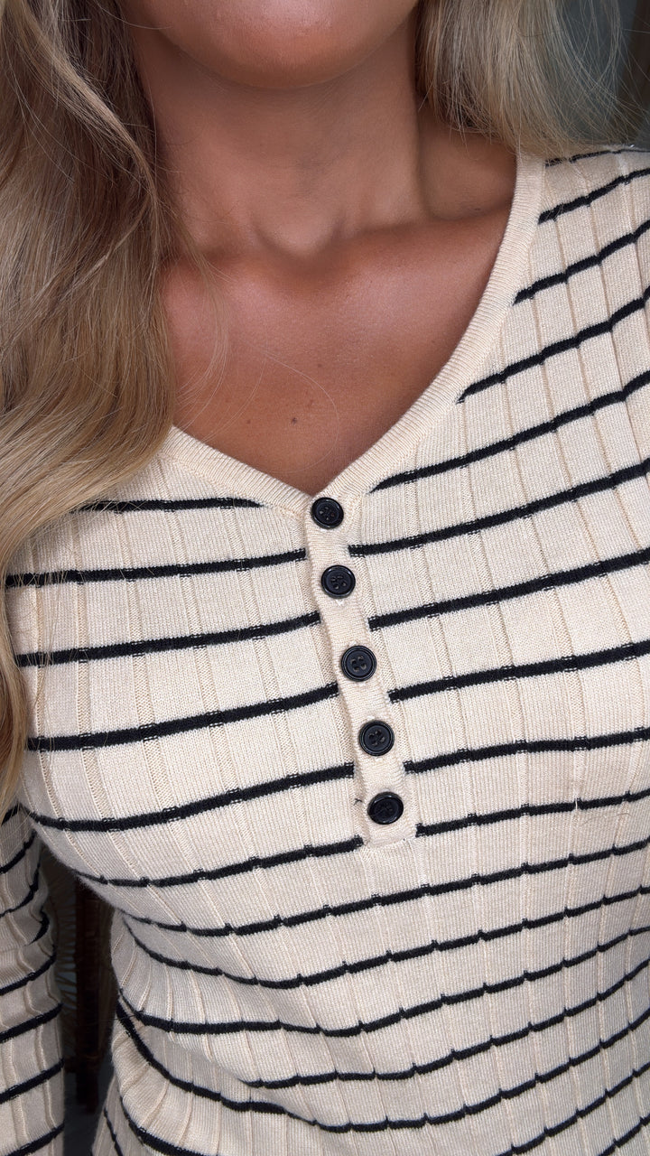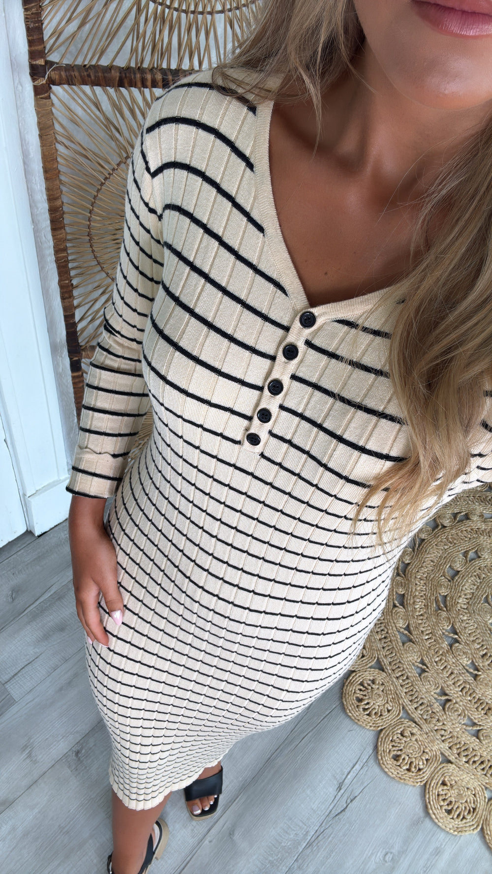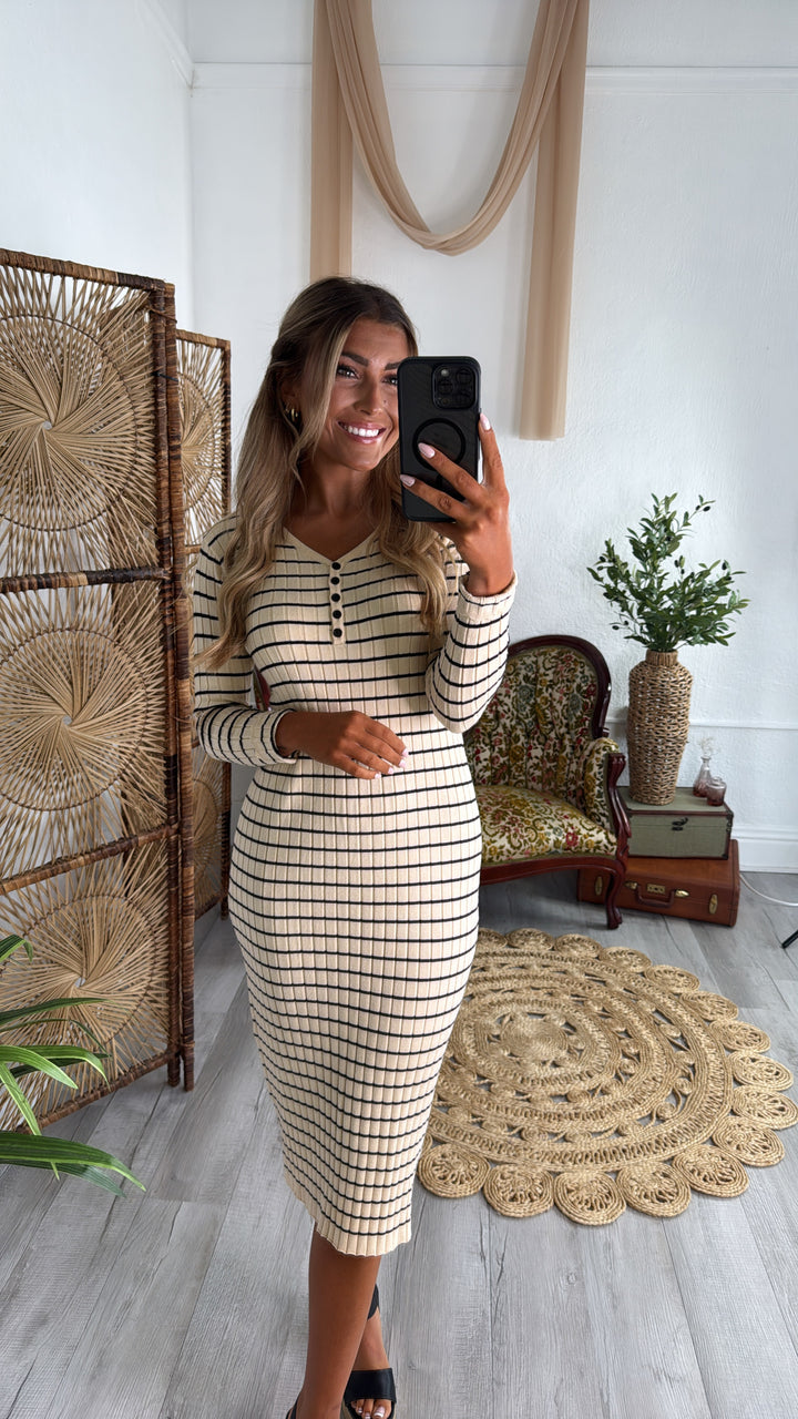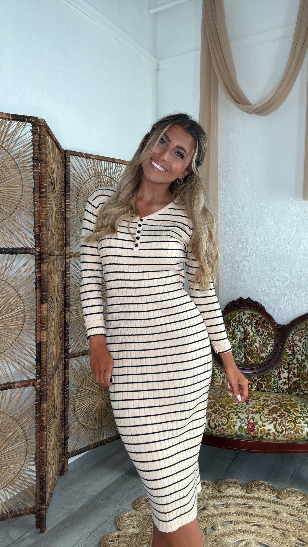 The Elowen Pearl Midi Dress is the most gorgeous sweater dress! Featuring a gorgeous cream color, black stripes, a button up bodice! Make sure to grab yours now!