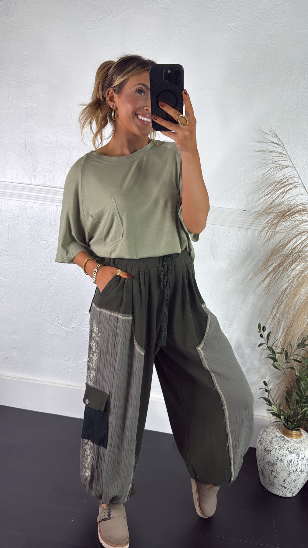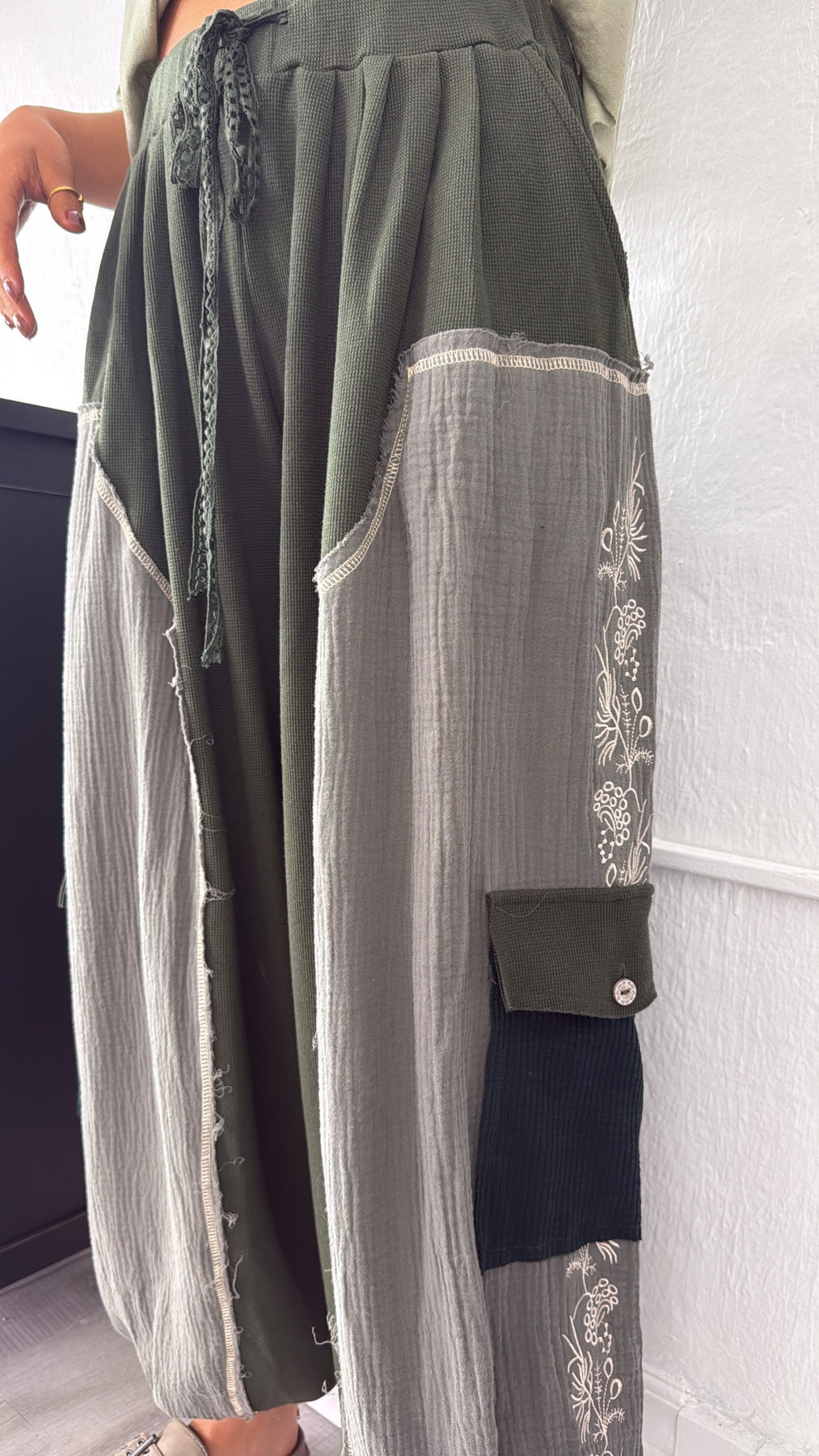 Meet your new favorite statement pant, a mix of comfort, creativity, and cool-girl energy. Designed with a patchwork blend of textured fabrics, these cargos feature tonal olive and sage hues, raw edge seaming, and embroidered floral detailing that give them that effortlessly lived-in, one-of-a-kind feel.