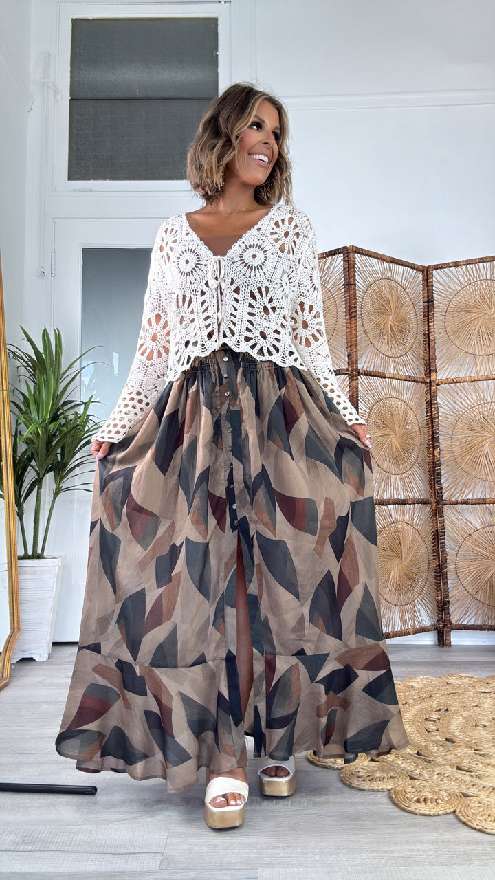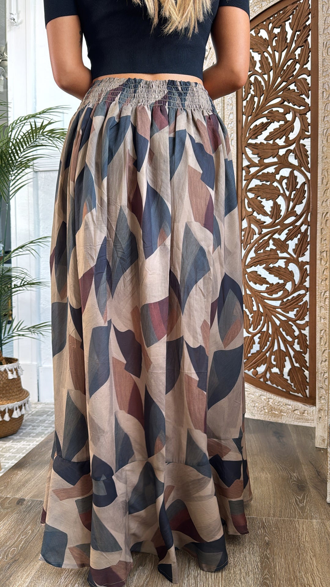 The Harvest Fade Maxi Skirt is a chic and versatile addition to your wardrobe. This skirt features a chic pattern and an elastic waist, providing both style and comfort.