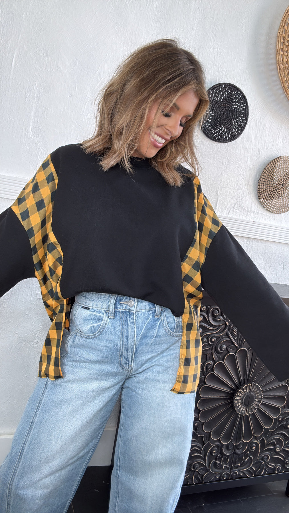 Own the occasion in the Jack O' Lantern Sweater Top. Featuring a full back Jack O' Lantern design with checkered print along the sides for added flare. Why fit in when you were born to stand out?!