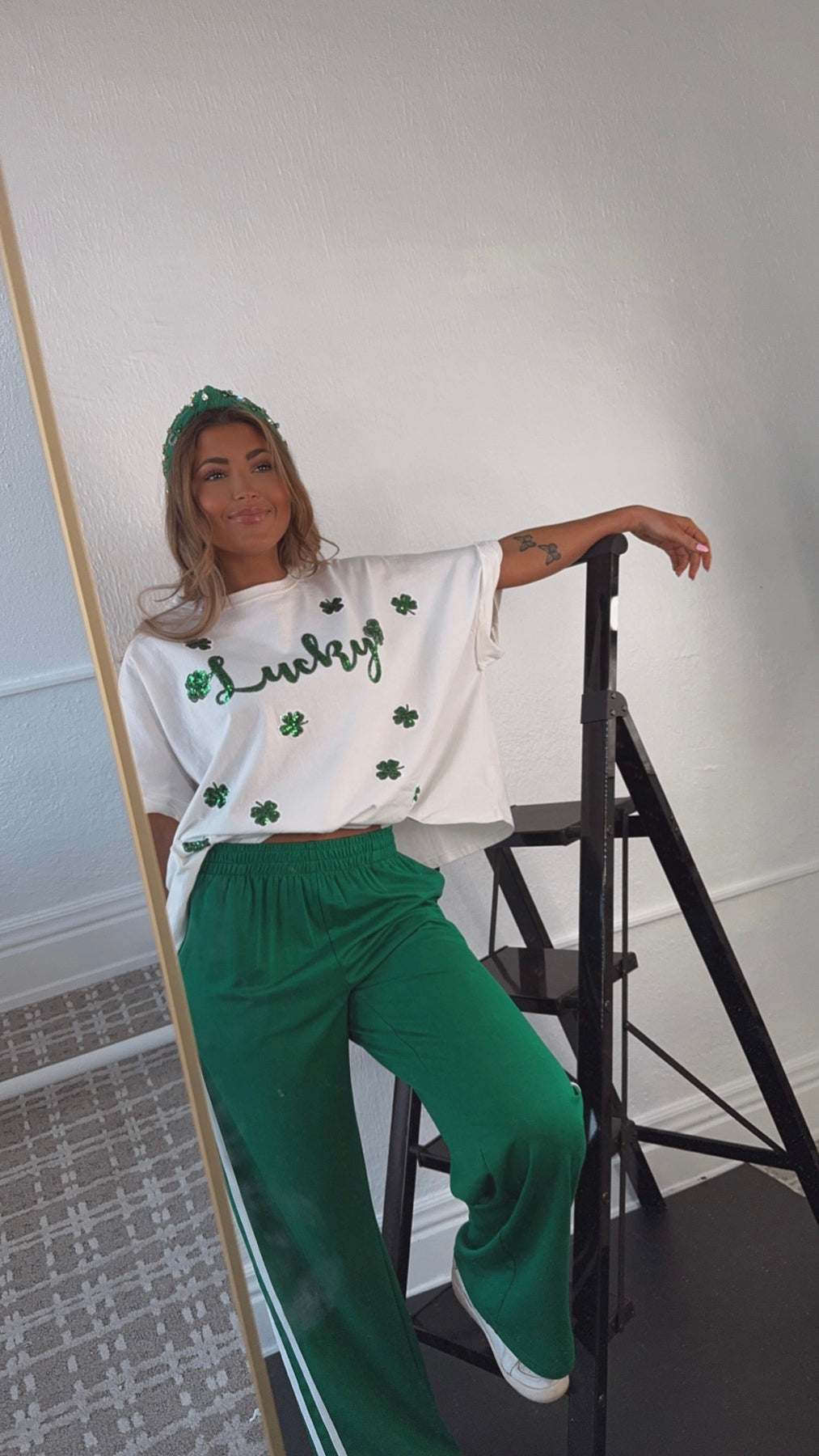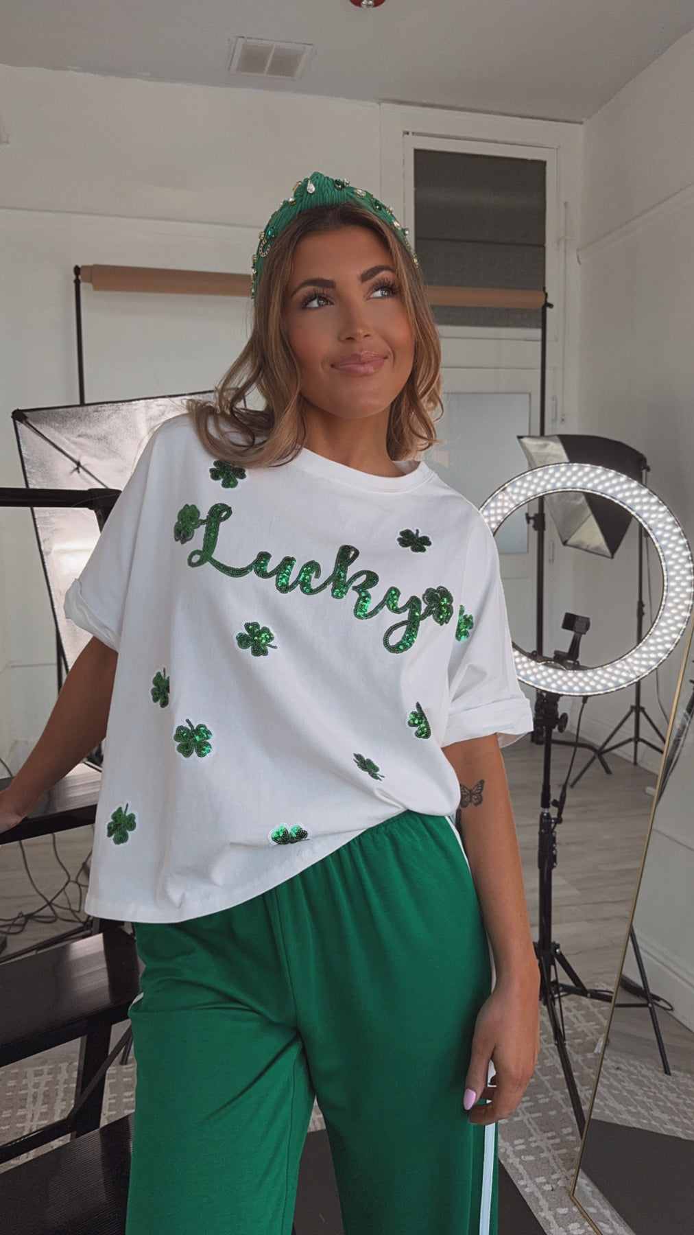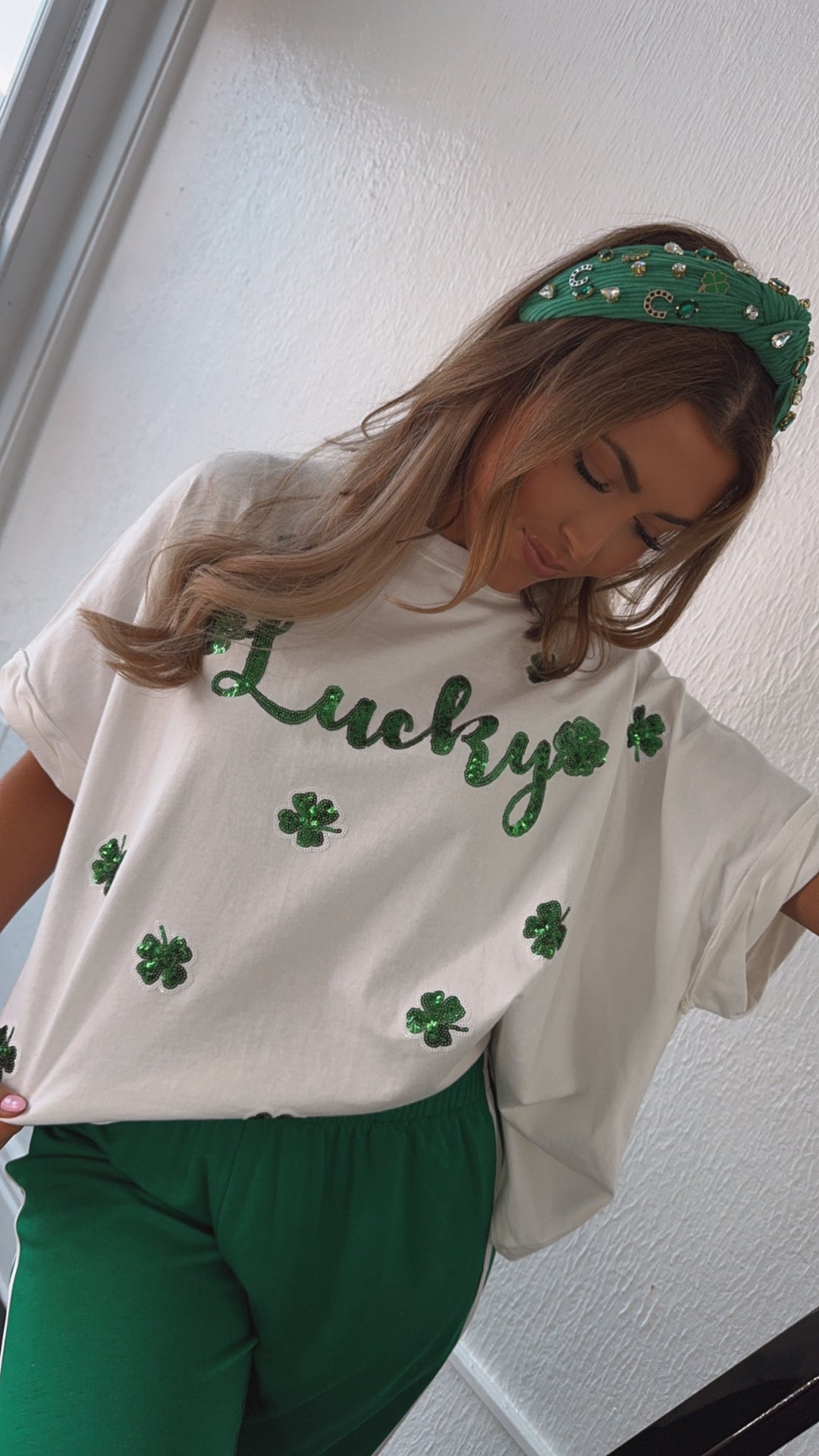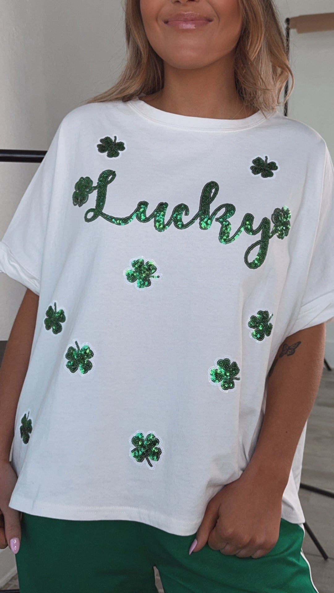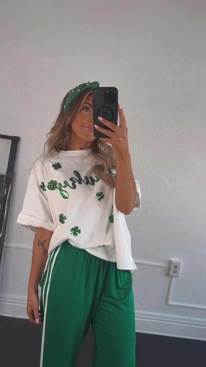 The Lucky Sequin Patch Top in White is a stunning addition to your St. Patrick's Day wardrobe! This eye-catching top features a white fabric adorned with shimmering sequin patches shaped like lucky charms. Perfect for celebrating the holiday in style.