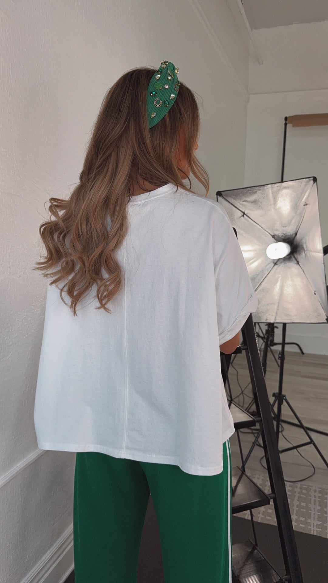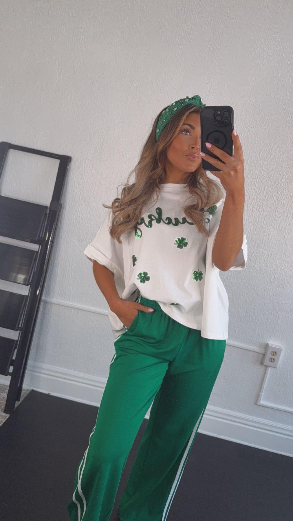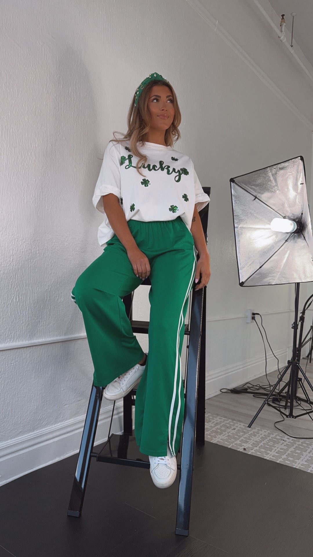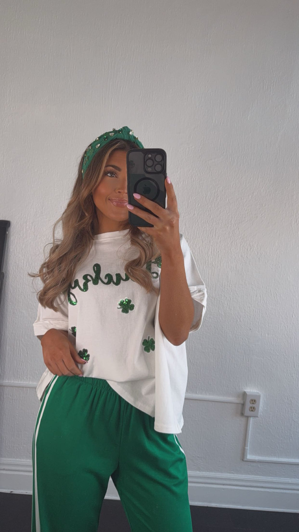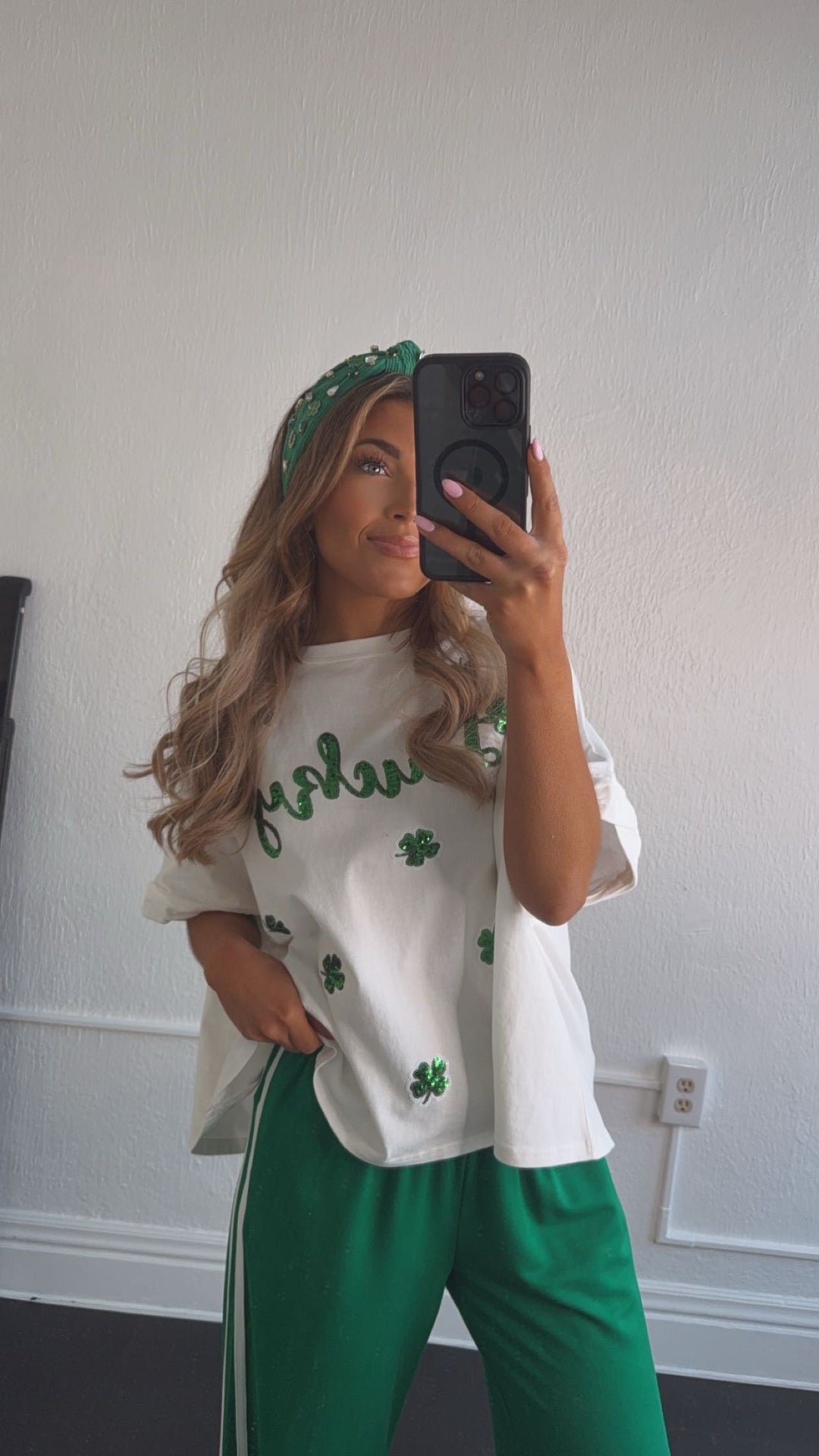 The Lucky Sequin Patch Top in White is a stunning addition to your St. Patrick's Day wardrobe! This eye-catching top features a white fabric adorned with shimmering sequin patches shaped like lucky charms. Perfect for celebrating the holiday in style.