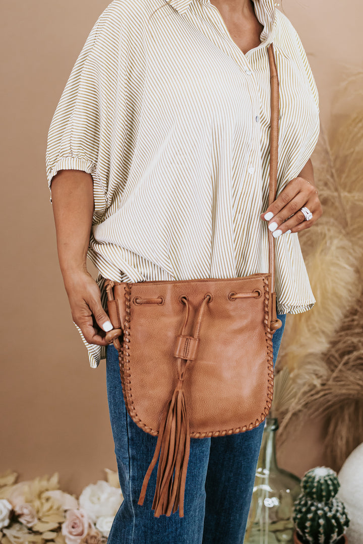 Classic drawstring leather crossbody bag with single chunky tassel. Inside zip compartments and CC slips. Backside slip pocket with magnetic closure.