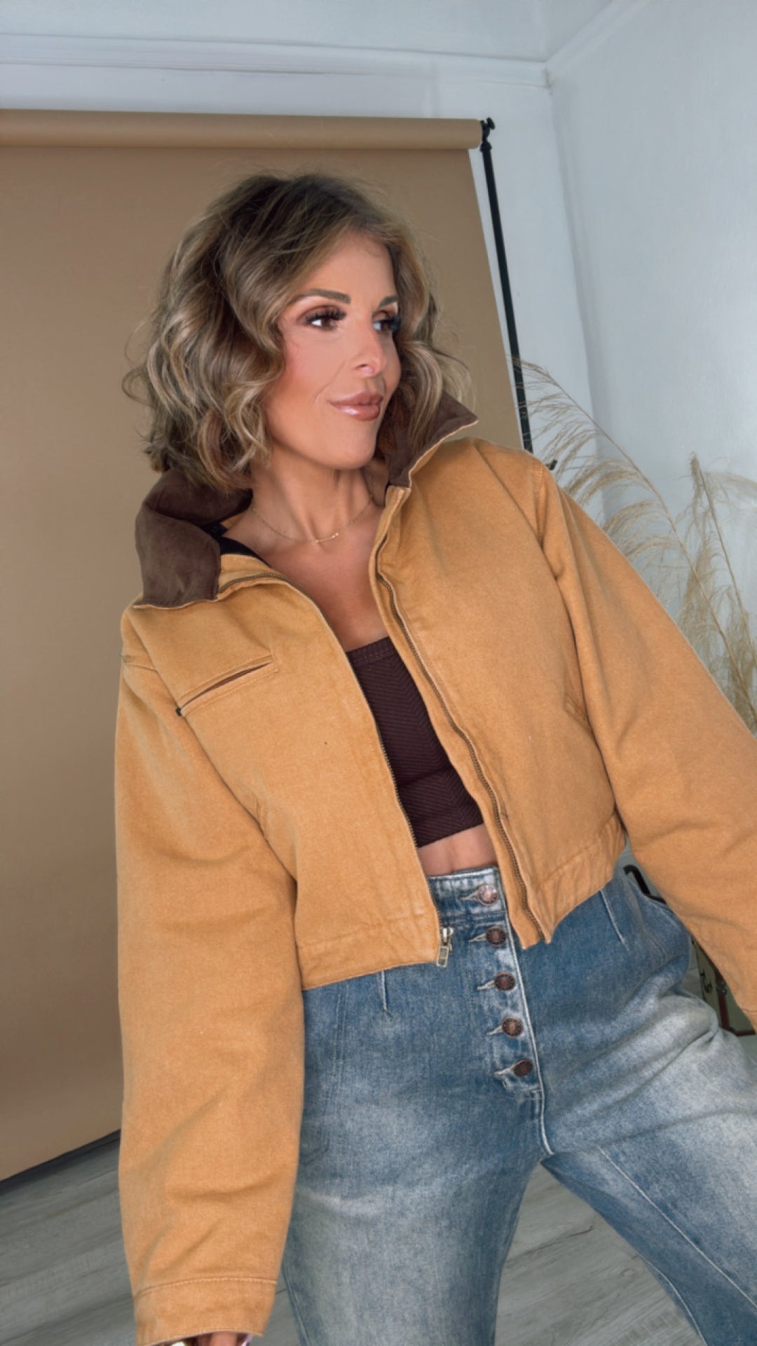 Ok this jacket is adorable and SOFT! Material is not stiff! Plus I get the farm wife look but cute and trendy with cropped Carhartt look! Fit is true to size. I go between small and medium, purchased a small with the perfect fit!