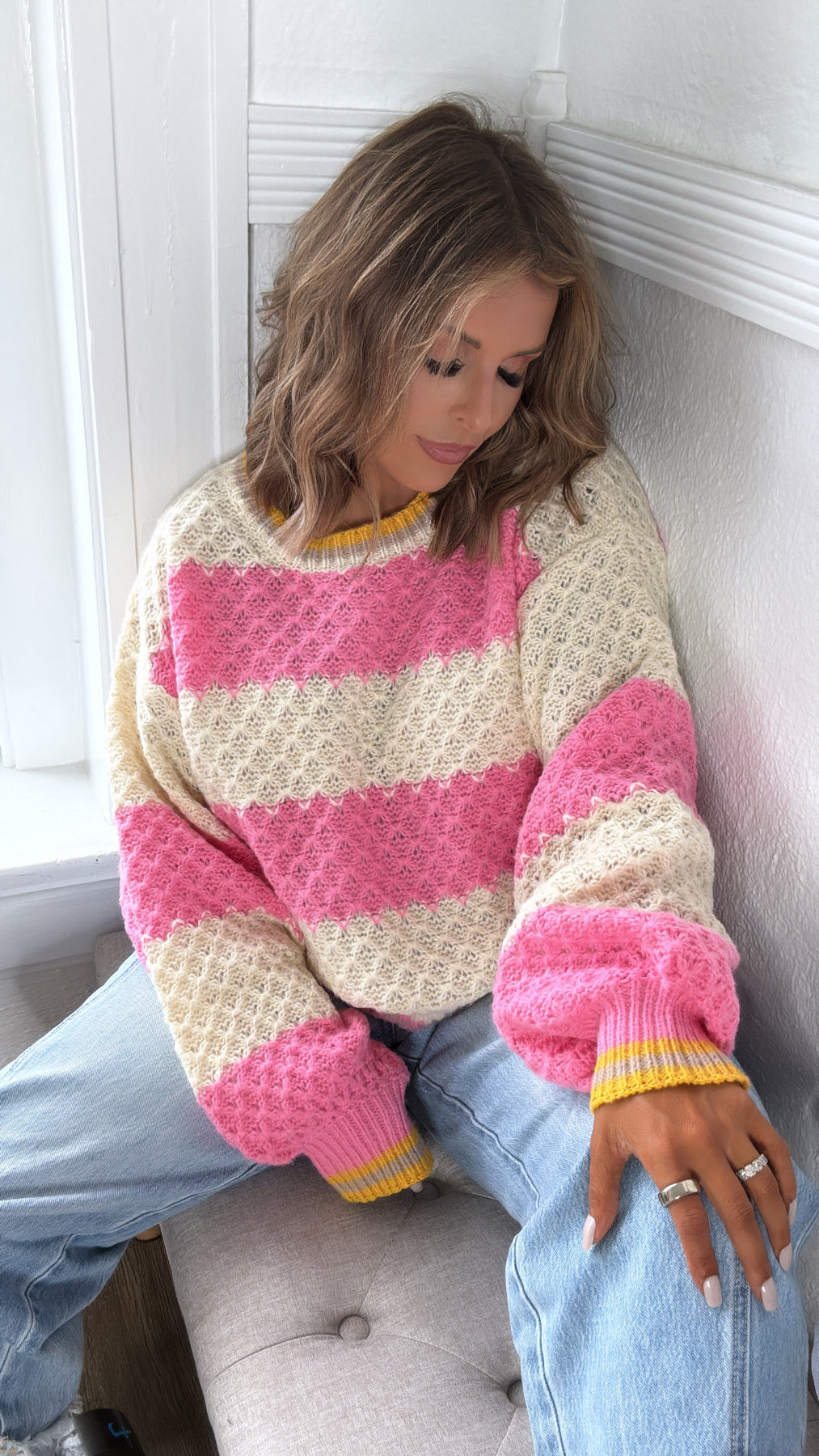 The Sweetheart Stitch Sweater is a stylish addition to your wardrobe. This premium knit sweater features intricate detailing, contrast stripe design, and a balloon sleeve. A gorgeous pop of color for the season!