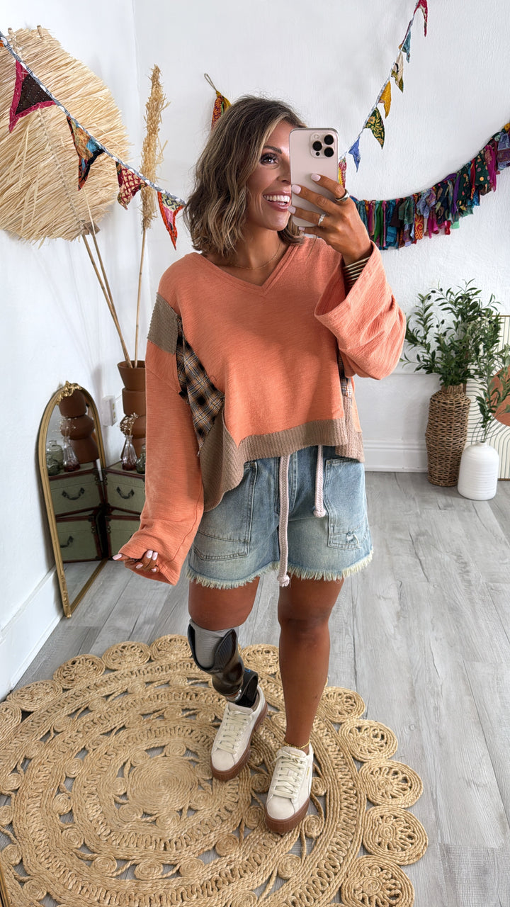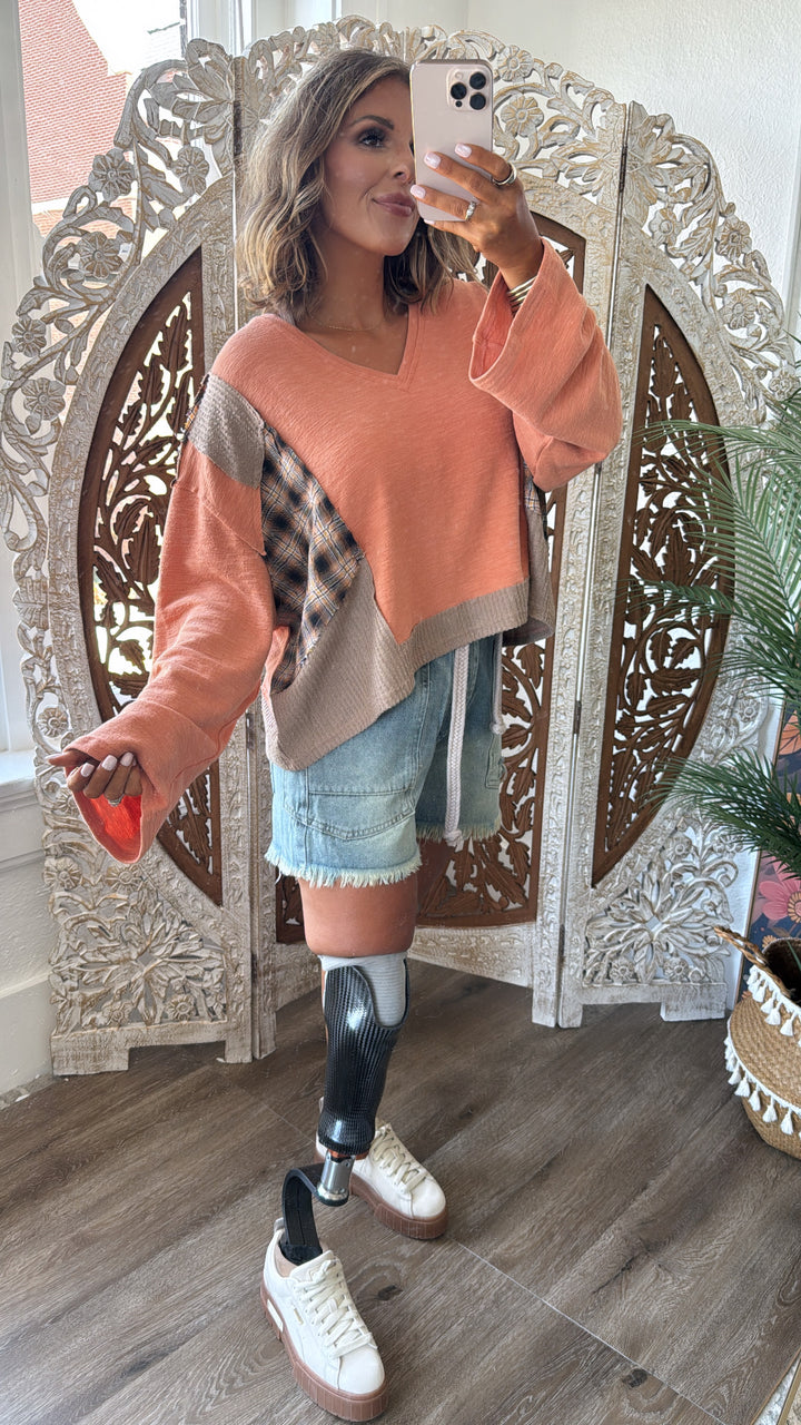 Stand out in our POL: Tattered Treasure Patchwork Long Sleeve Top - this unique patchwork top features a textured knit with a plaid contrast. You'll reach for this all season long!