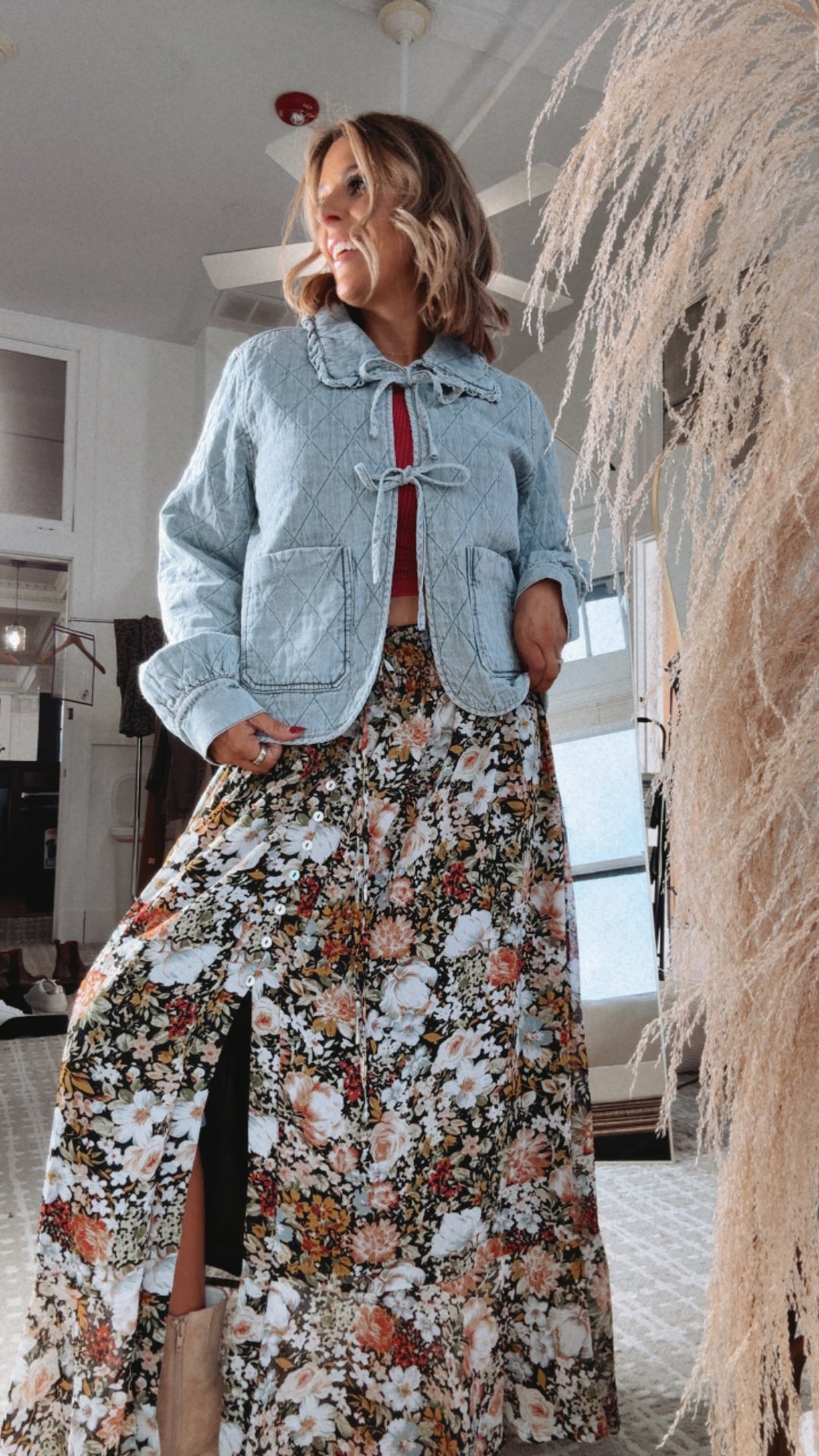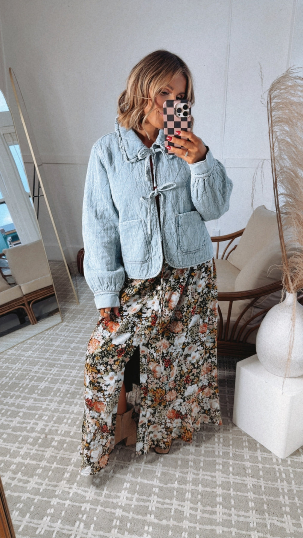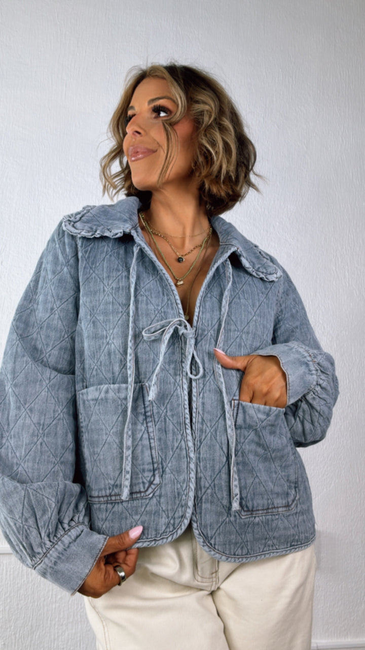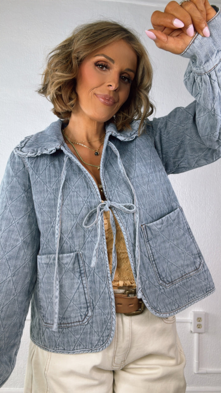 Stay in style with this cute quilted jacket! Featuring a trendy tied front and fun ruffled collar, this cutie is sure to turn heads.