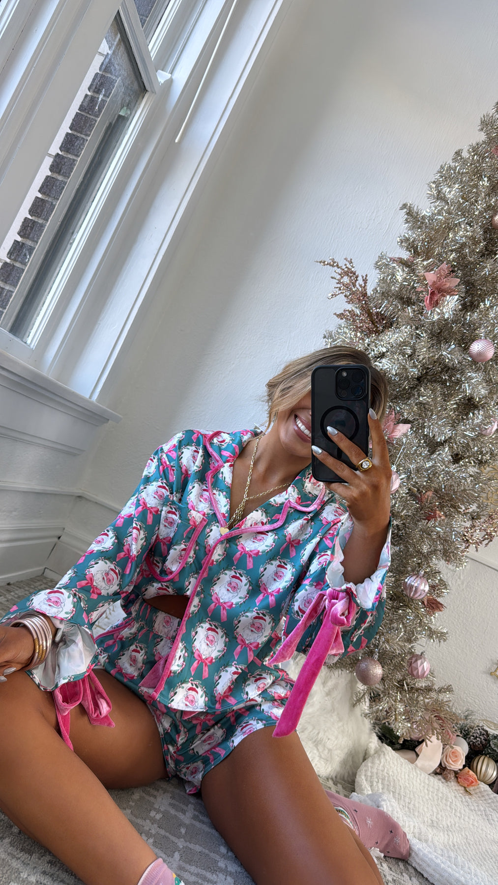 The most wonderful time of the year made complete with the cutest pj set! Our Season Greetings Silk Santa Bow Pajama Set features a bow accent detail and velvet trim! You will be living in these all season long!!