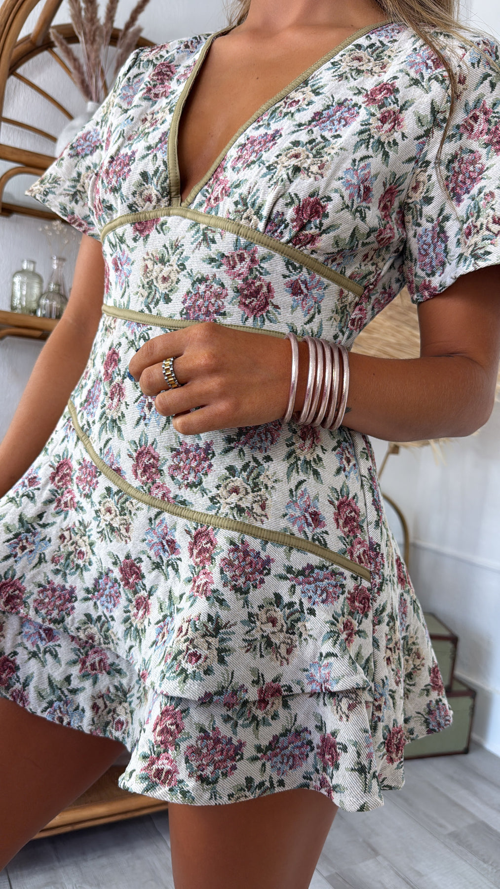 Slip into perfection with the Stillwater Bloom Mini Romper Dress! Boho florals elevate this piece, making it an eye-catching look. The exposed seam detail, romper style fit, and plunge neckline make it fun and flirty.
