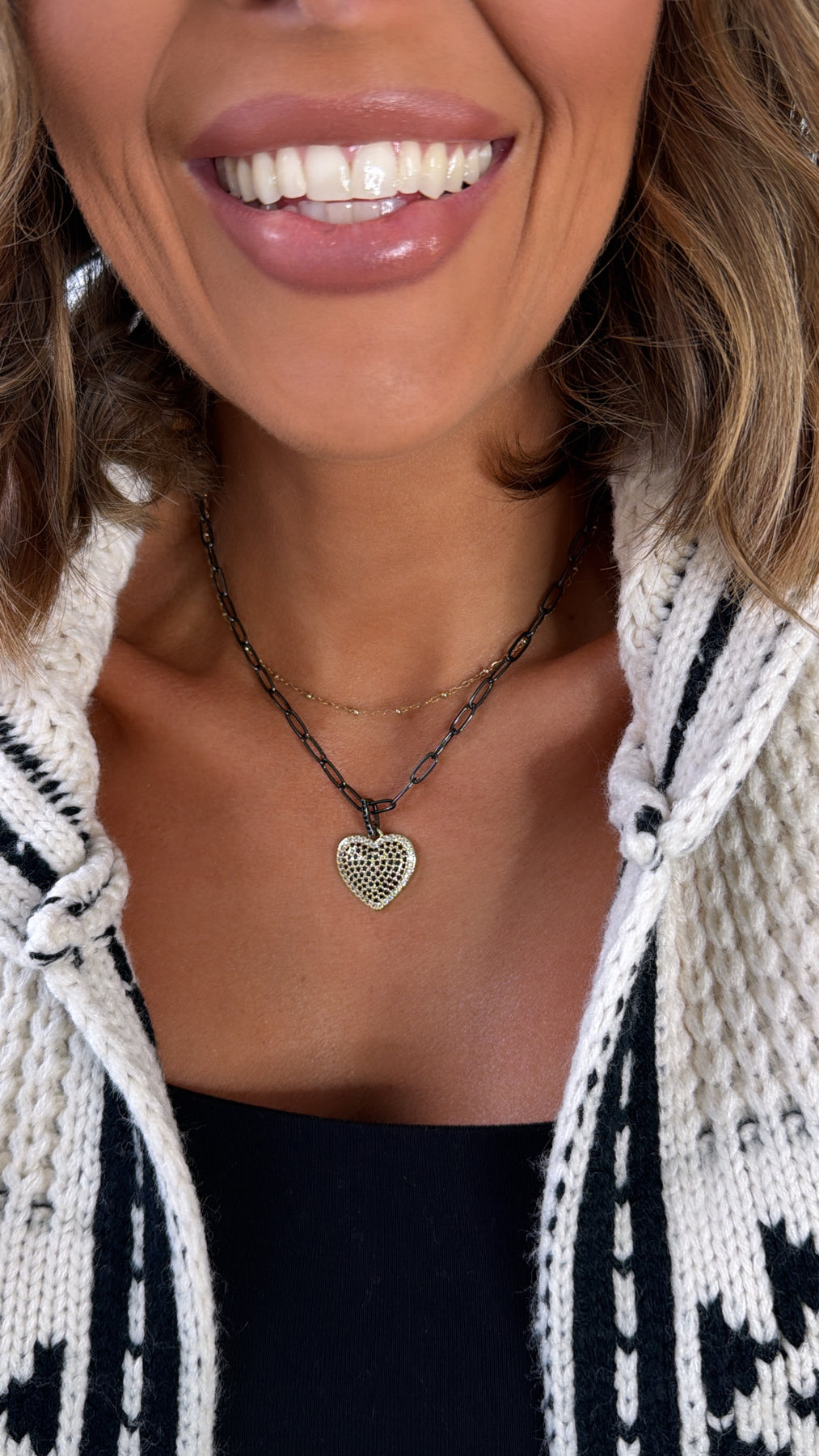 Bold, chic, and full of heart—literally. The You Got My Heart Black Necklace features a sleek black paperclip chain paired with a textured gold heart pendant that steals the spotlight. Its mixed-metal look gives it an effortless, edgy vibe while still keeping things sweet and sentimental.